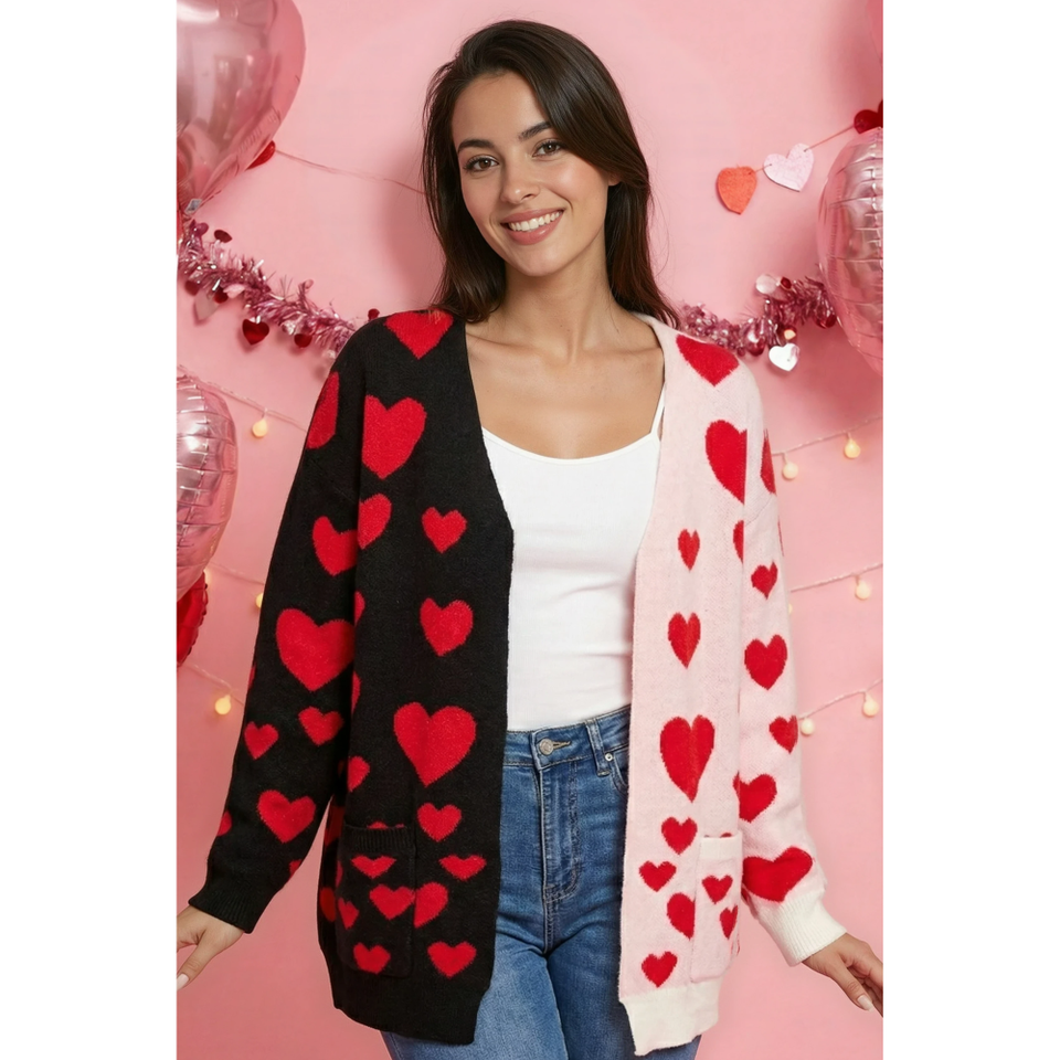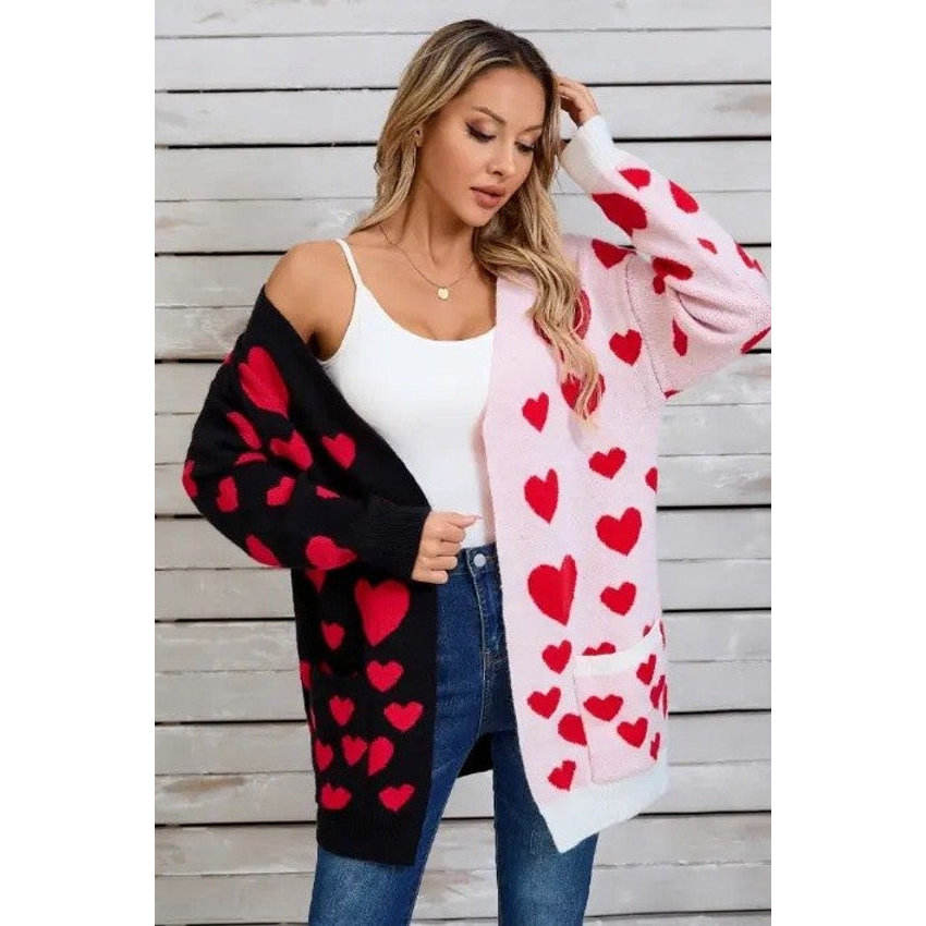เสื้อคลุมคาร์ดิแกนลายหัวใจสองสีสไตล์ลำลองสำหรับฤดูใบไม้ร่วง แขนยาวครึ่งแขน ทำจากผ้าขนสัตว์และแคชเมียร์ ตกแต่งด้วยกระดุมแบบทอ