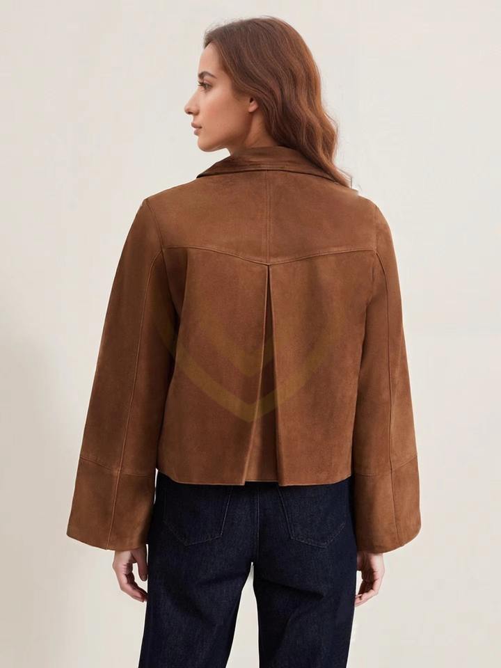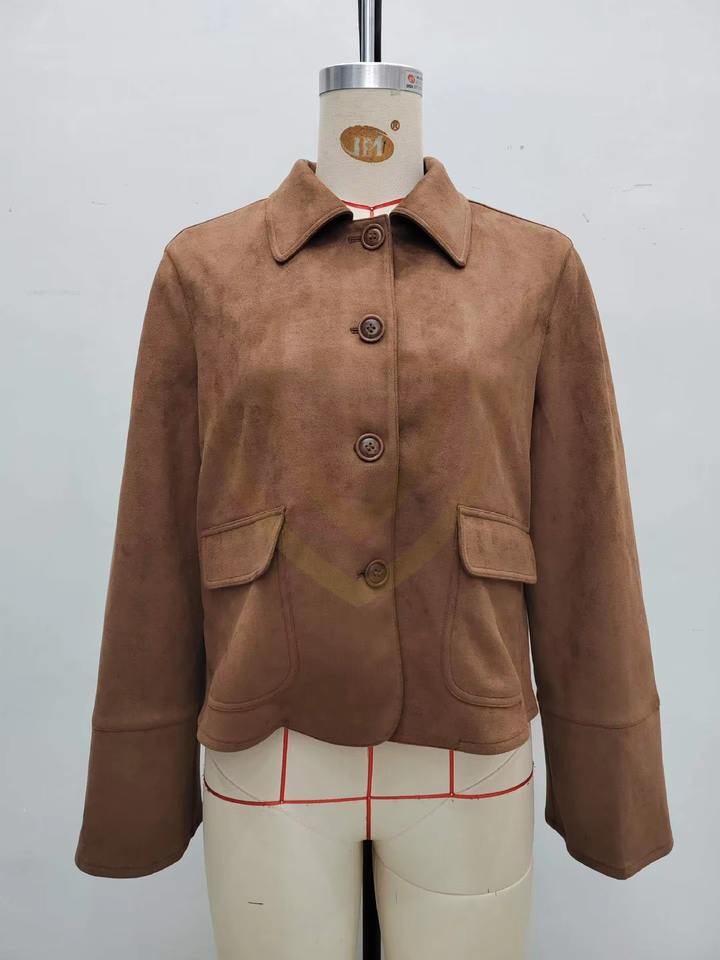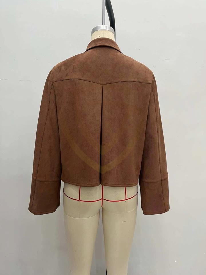 เสื้อแจ็คเก็ตหนังกลับสไตล์วินเทจสำหรับผู้หญิงแฟชั่นฤดูใบไม้ร่วง ปกคอพับ แขนยาว
