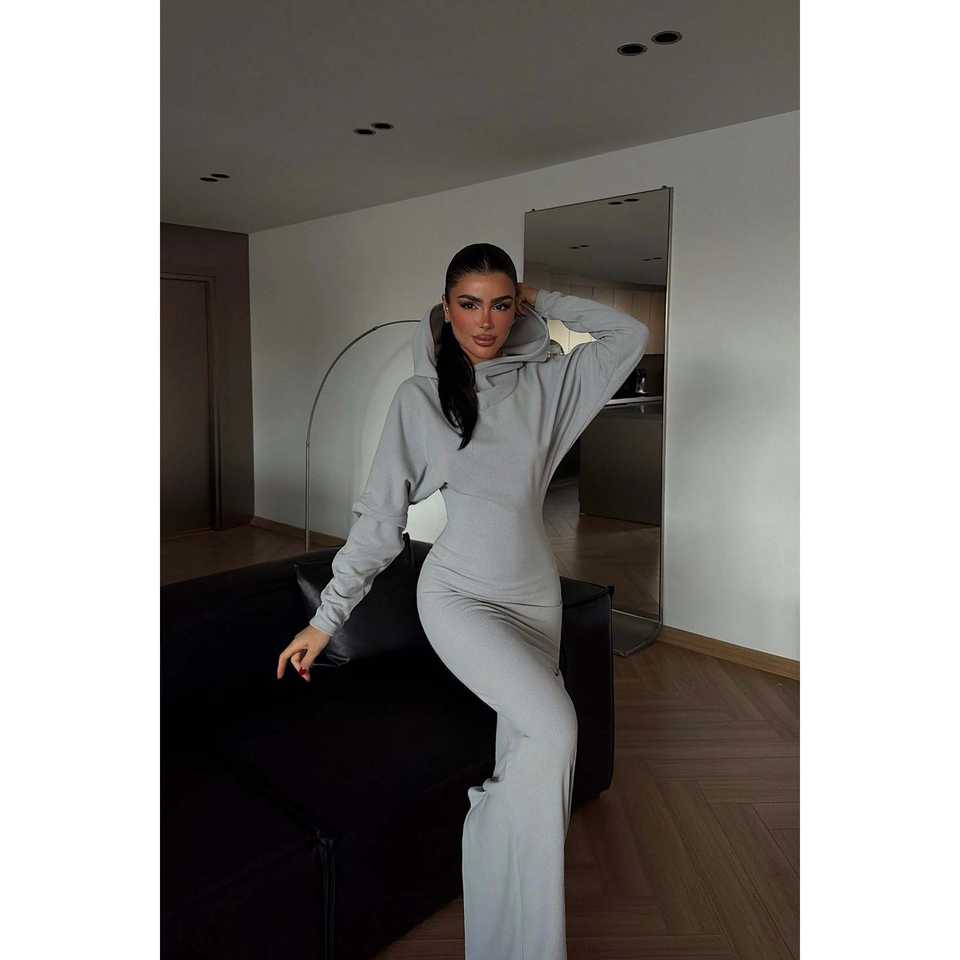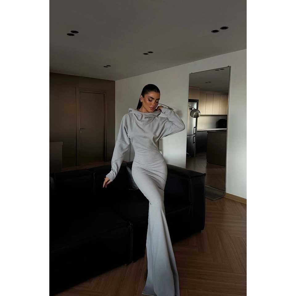 เดรสยาวคลุมฮู้ดสีเทาออทัมน์ แม็กมา ทรงหลวมเข้ารูป ผ้ายืดสแปนเด็กซ์ ความยาวคลุมเท้า เอวทรงธรรมชาติ ลายถักพิมพ์ลาย