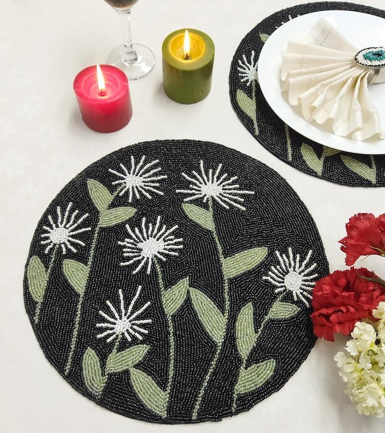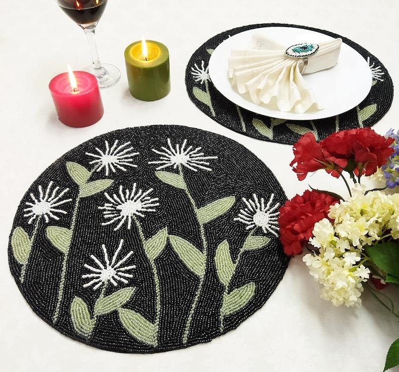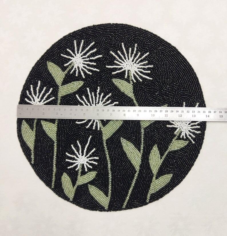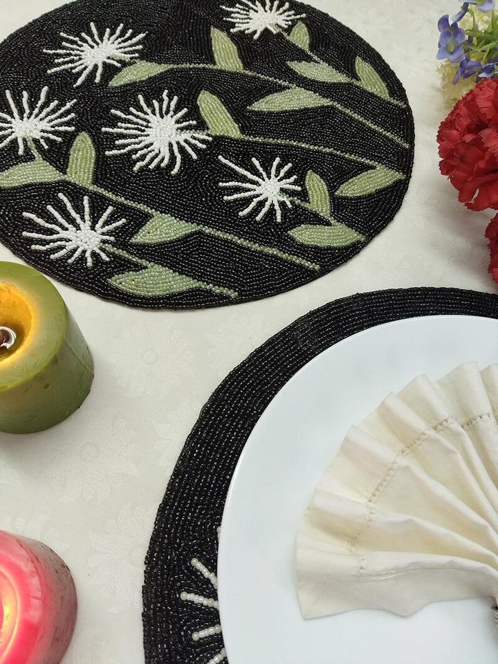แผ่นรองจานลายใบไม้ประดับลูกปัดหลากสีสัน สไตล์หรูหรา แรงบันดาลใจจากฤดูใบไม้ร่วง งานปักมือ เป็นมิตรกับสิ่งแวดล้อม เหมาะสำหรับงานแต่งงาน ปรับแต่งได้ แบบดั้งเดิม