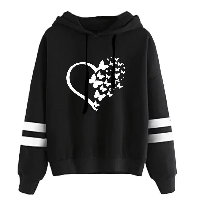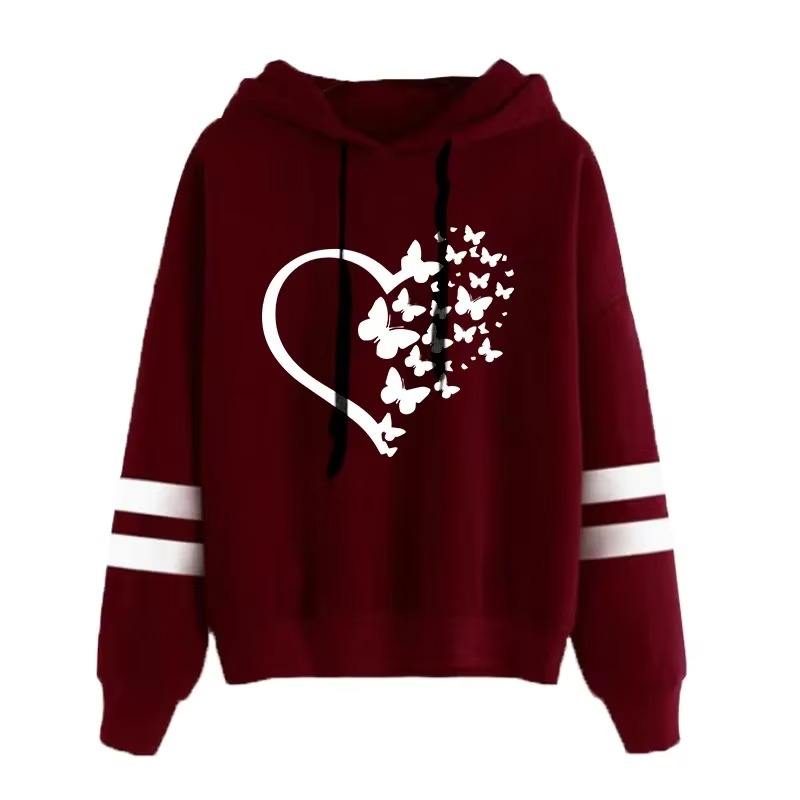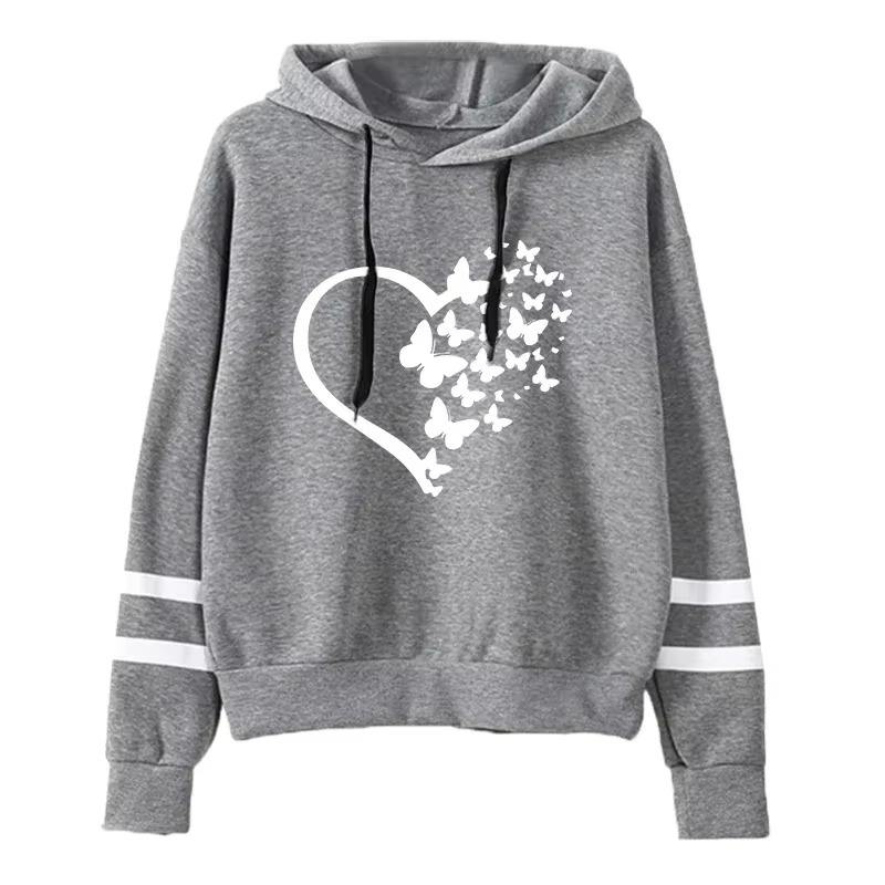 เสื้อกันหนาวให้ความอบอุ่นทรงหลวมฤดูใบไม้ร่วงมีฮู้ดสำหรับผู้หญิงทันสมัยมีฮู้ดในเมืองแฟชั่นลำลองมีฮู้ดแขนยาวแบบสวมหัวพิมพ์ลายผีเสื้อ