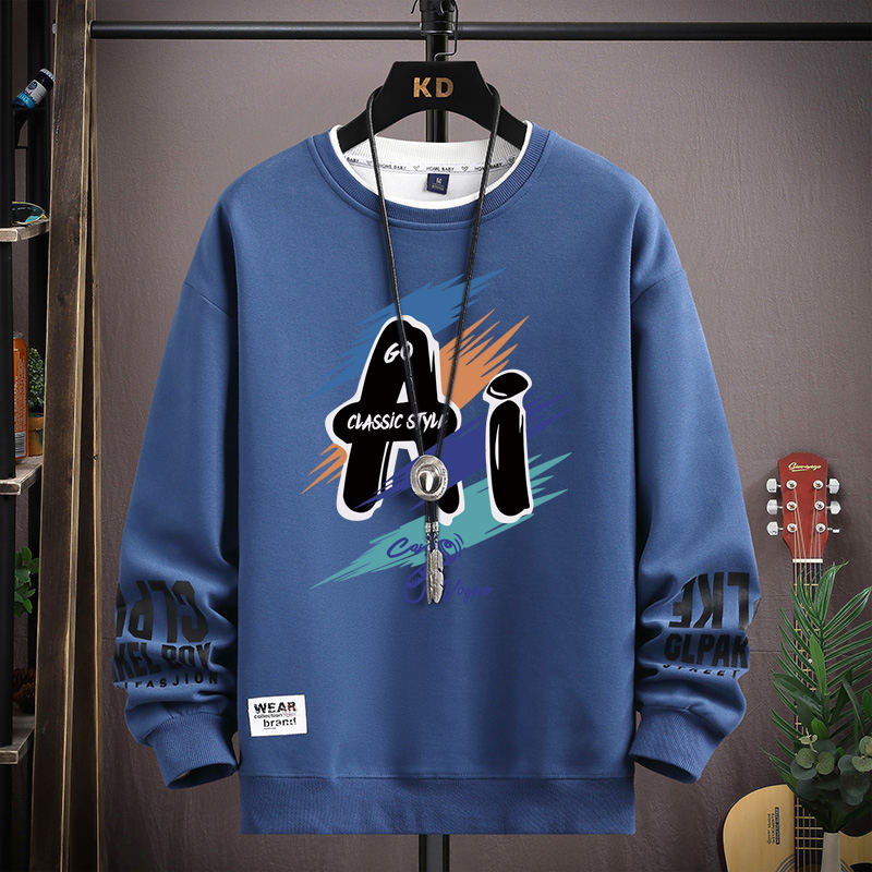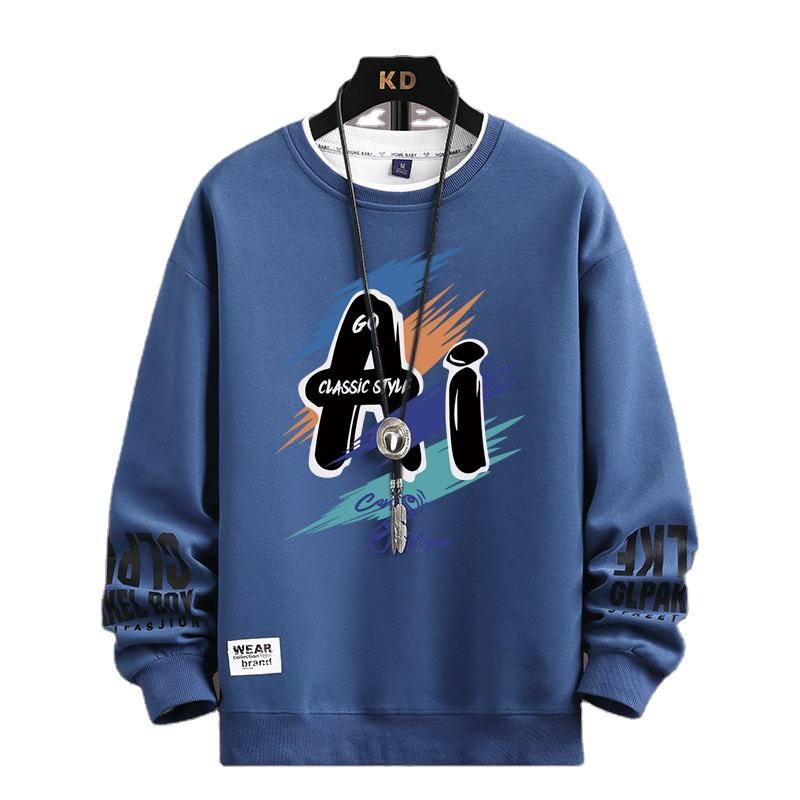 เสื้อสเวตเตอร์ผู้ชายสำหรับฤดูใบไม้ร่วงเสื้อยืดแขนยาวพิมพ์ลายอินเทรนด์เสื้อยืดแฟชั่นผู้ชายสีกากี O คอฮาราจูกุเสื้อออกแบบพิเศษใหม่