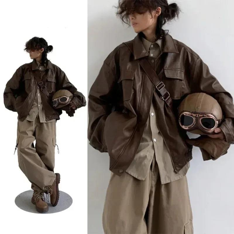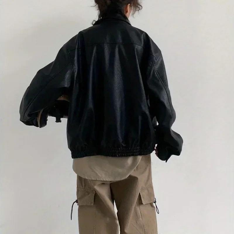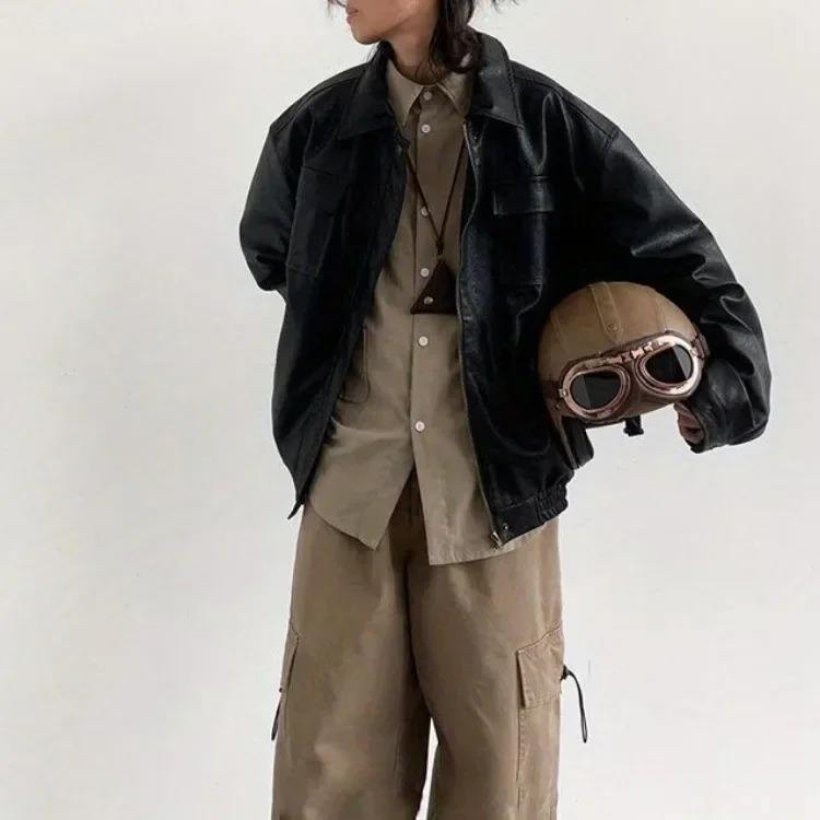 แจ็คเก็ตคู่หนัง PU แบบกระเป๋าหน้าอกคู่, เสื้อโค้ทหนังเทียมทรงหลวมสำหรับขี่มอเตอร์ไซค์
