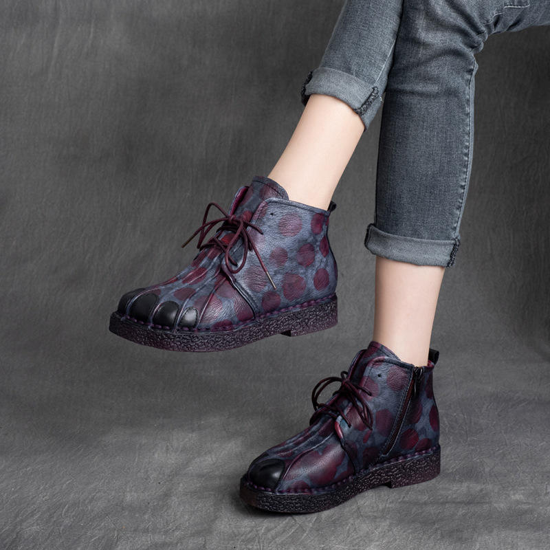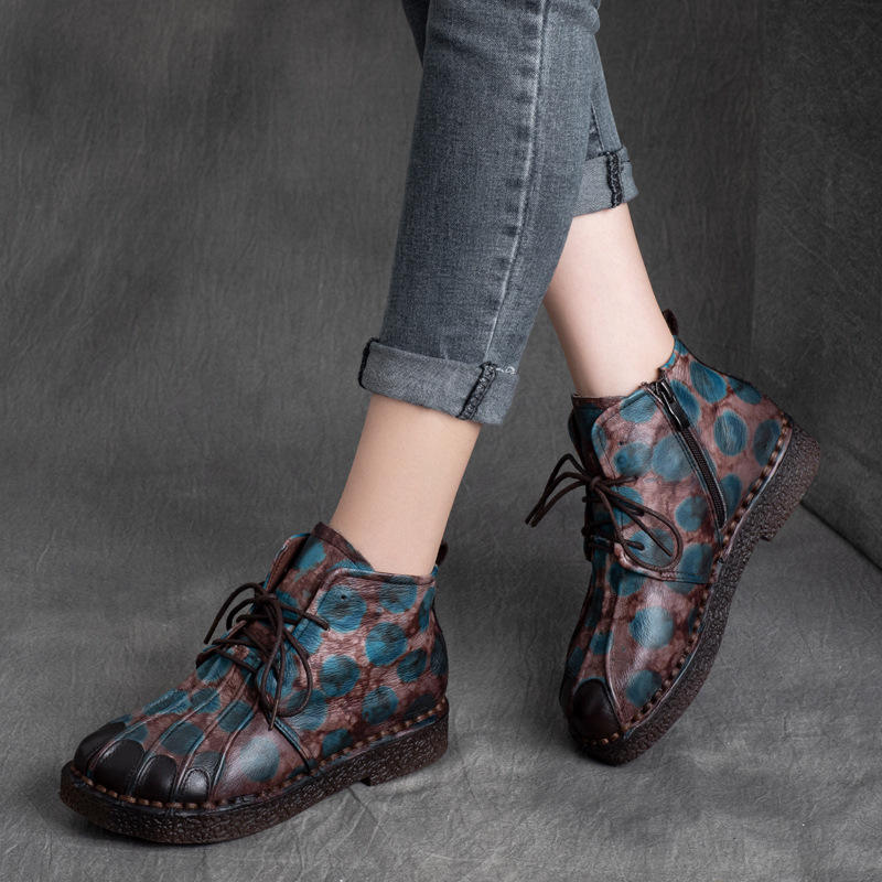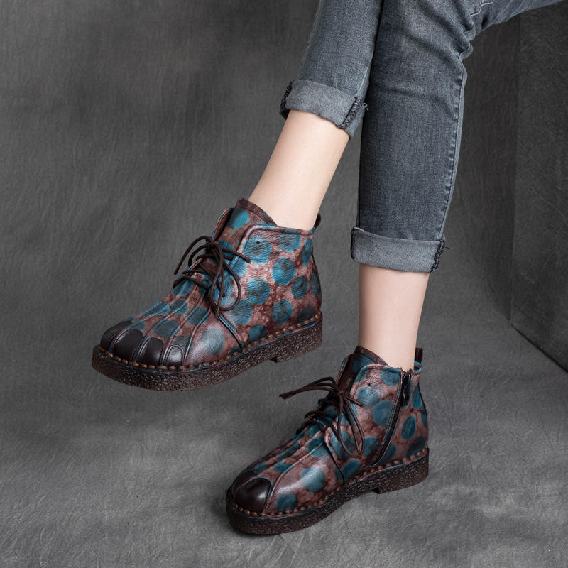 รองเท้าบูทส้นแบนแบบผูกเชือก สไตล์ชาติพันธุ์ย้อนยุค หนังวัวแท้ พื้นนุ่ม สีสันตัดกัน สำหรับผู้หญิง คอลเลคชั่นฤดูใบไม้ร่วง