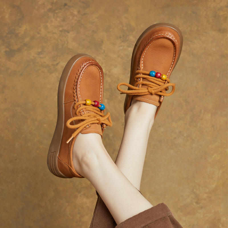 รองเท้าผู้หญิงสไตล์เรโทรใหม่สำหรับฤดูร้อน ทำจากหนัง PU แบบผูกเชือก พื้นนุ่ม แบบสวม พื้นหนา กันลื่น