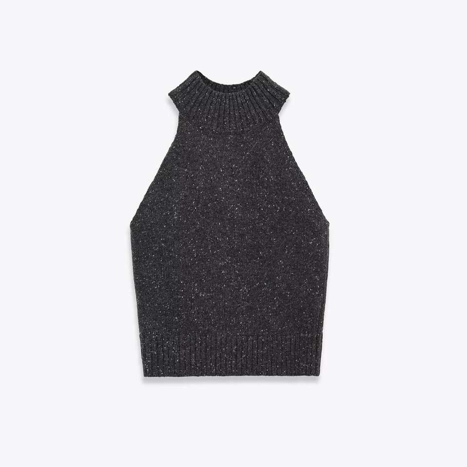 เสื้อกั๊กถักสำหรับผู้หญิงคอเปิดไหล่แขนกุดคอปกสูงแบบเรียบง่ายใหม่ฤดูใบไม้ร่วง