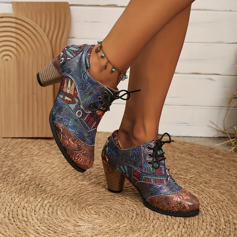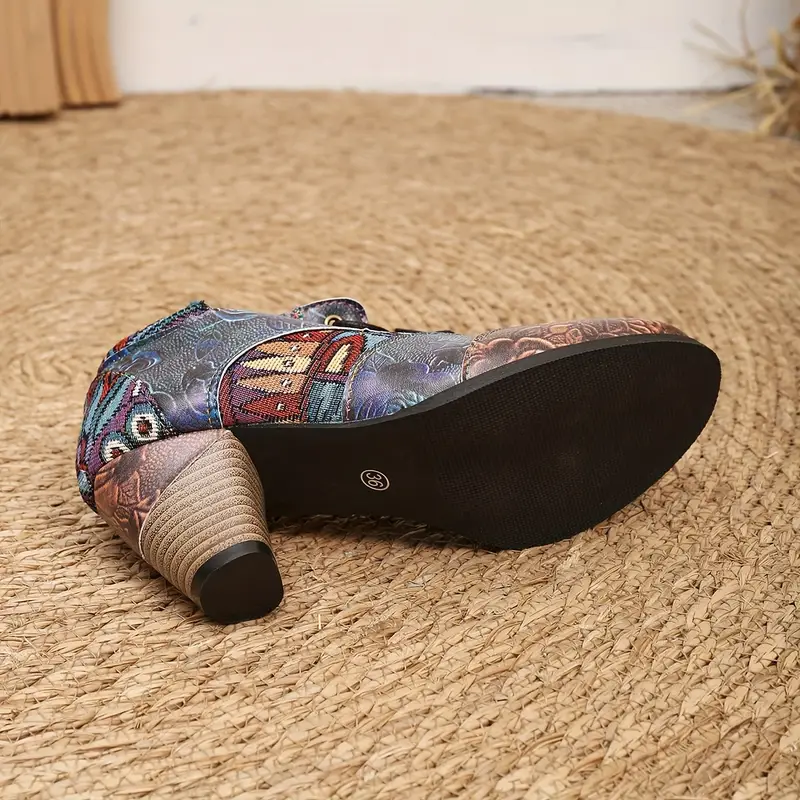 รองเท้าบูทข้อเท้าส้นสูงแฟชั่นงานปาร์ตี้ฤดูใบไม้ร่วงสำหรับผู้หญิง ลายพิมพ์หลากหลาย สไตล์ตะวันตก แบบผูกเชือก กันลื่น ส้นเหลี่ยม หน้าผ้า PU บุด้วยผ้าฝ้าย