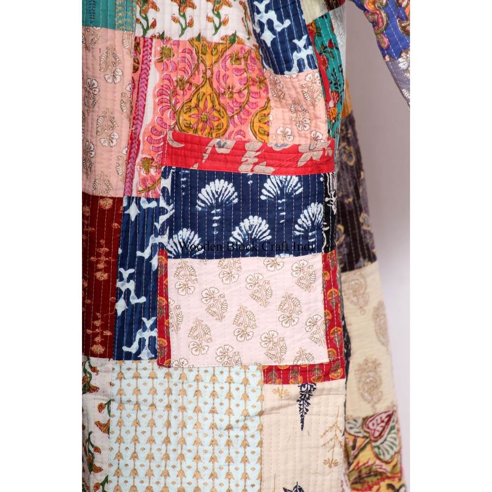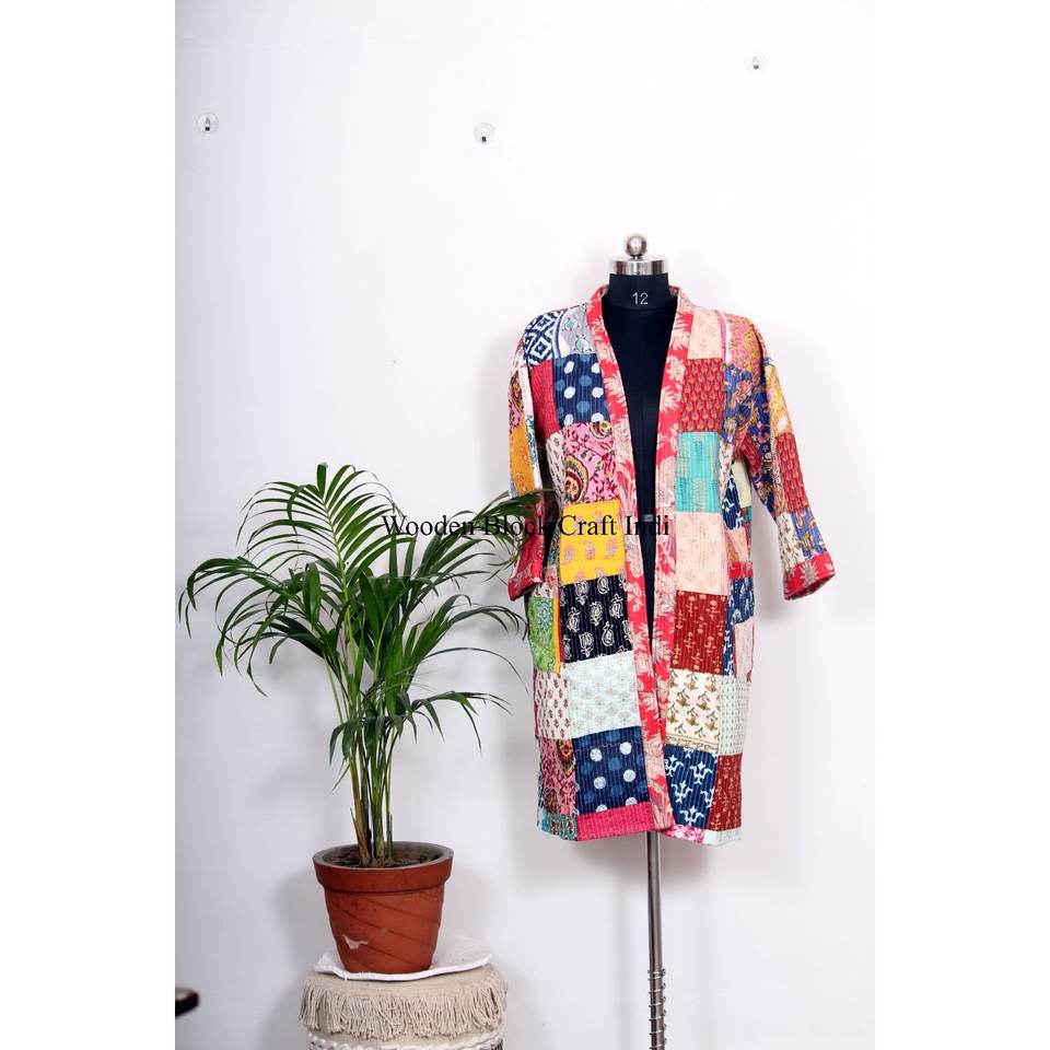 ชุดเดรสชายหาดสไตล์วินเทจสำหรับฤดูใบไม้ร่วง ผ้าไหมควิลท์แบบคันธา ชุดรีสอร์ทฤดูหนาว ผ้าฝ้ายอินเดียแบบคันธา เสื้อคลุมกิโมโนแบบคันธา