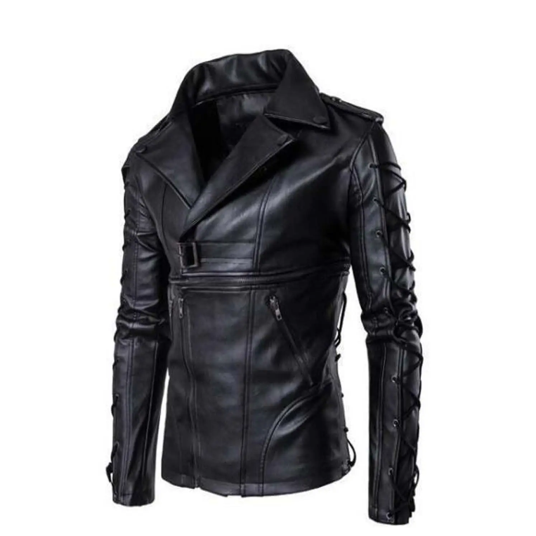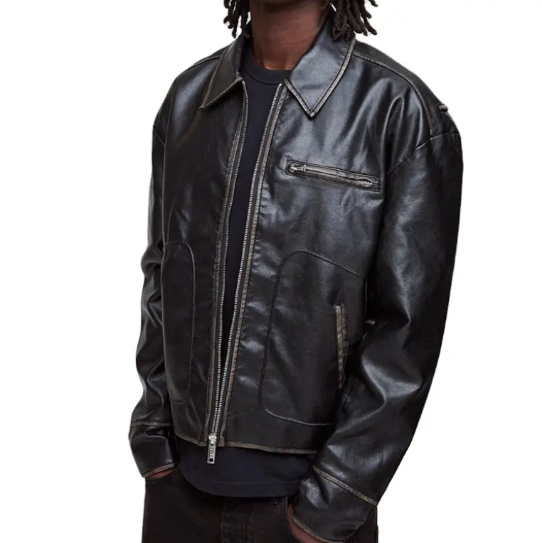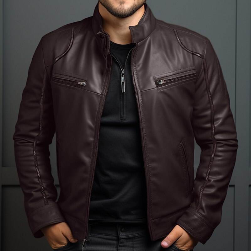 แจ็คเก็ตหนังผู้ชายคอตั้งแบบซิป ผลิตจากโพลีเอสเตอร์ผสมผ้าฝ้าย แฟชั่นฤดูใบไม้ร่วง ทรงเข้ารูป มีไซส์พลัส แจ็คเก็ตสไตล์นักขี่มอเตอร์ไซค์