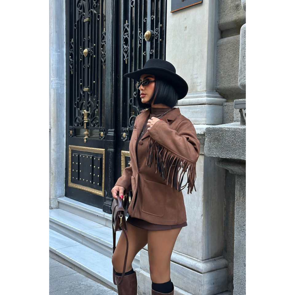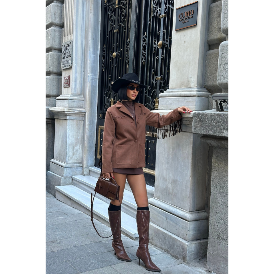 เสื้อแจ็คเก็ตหนังกลับสีน้ำตาลสไตล์ฤดูใบไม้ร่วง/ฤดูใบไม้ผลิ แต่งพู่หนังแกะ โลโก้สั่งทำได้ ทรงโอเวอร์ไซส์ สไตล์บอมเบอร์ ไซส์ XL ผ้าโพลีเอสเตอร์