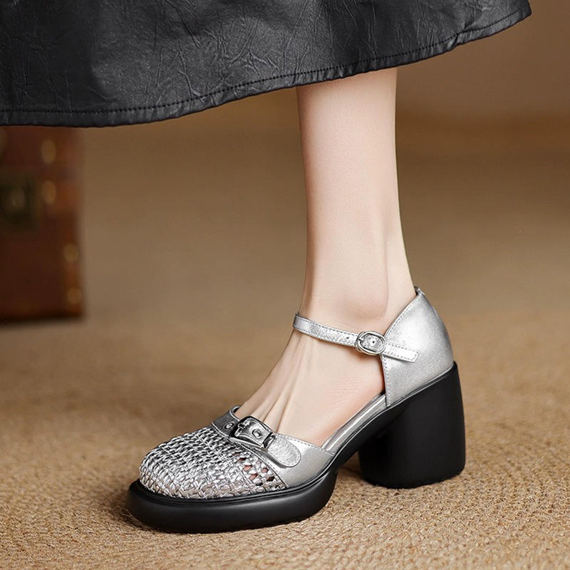 รองเท้าส้นตึกแบบสวม รุ่นใหม่ประจำฤดูใบไม้ร่วงและฤดูร้อน ดีไซน์แบบแมรี่เจน สำหรับเจ้าสาว หนังพรีเมียม สไตล์เรโทรฝรั่งเศส สายไขว้