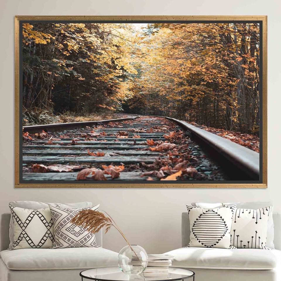 ภาพพิมพ์บนผ้าใบลายรางรถไฟในฤดูใบไม้ร่วง: ภาพพิมพ์แขวนผนังลายทิวทัศน์ พร้อมกรอบสีทอง