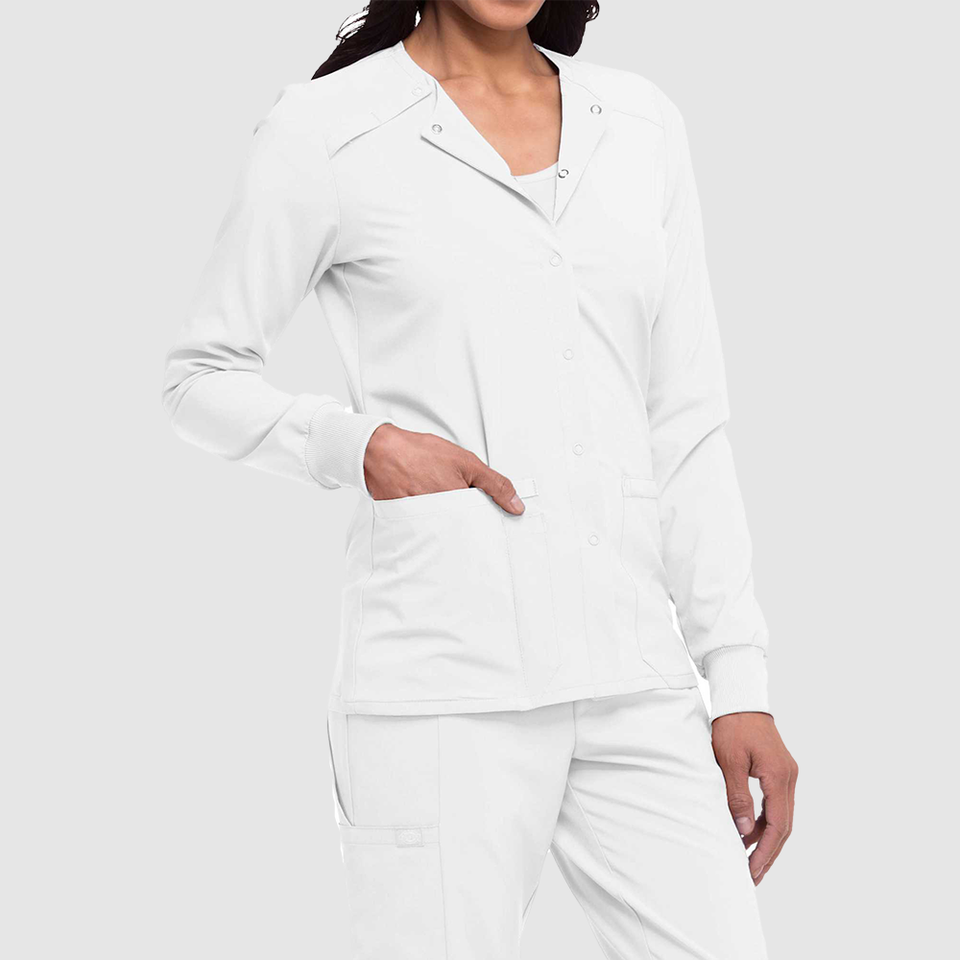 ชุดยูนิฟอร์มโรงพยาบาลสำหรับผู้หญิง ผ้าโพลีเอสเตอร์ผสมสแปนเด็กซ์ ยืดหยุ่น ระบายอากาศ ป้องกันรอยยับ สวมใส่สบาย ตรวจจับด้วยเข็มได้ รุ่น Autumn Warm Custom Jersey