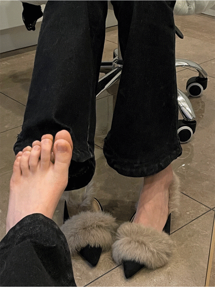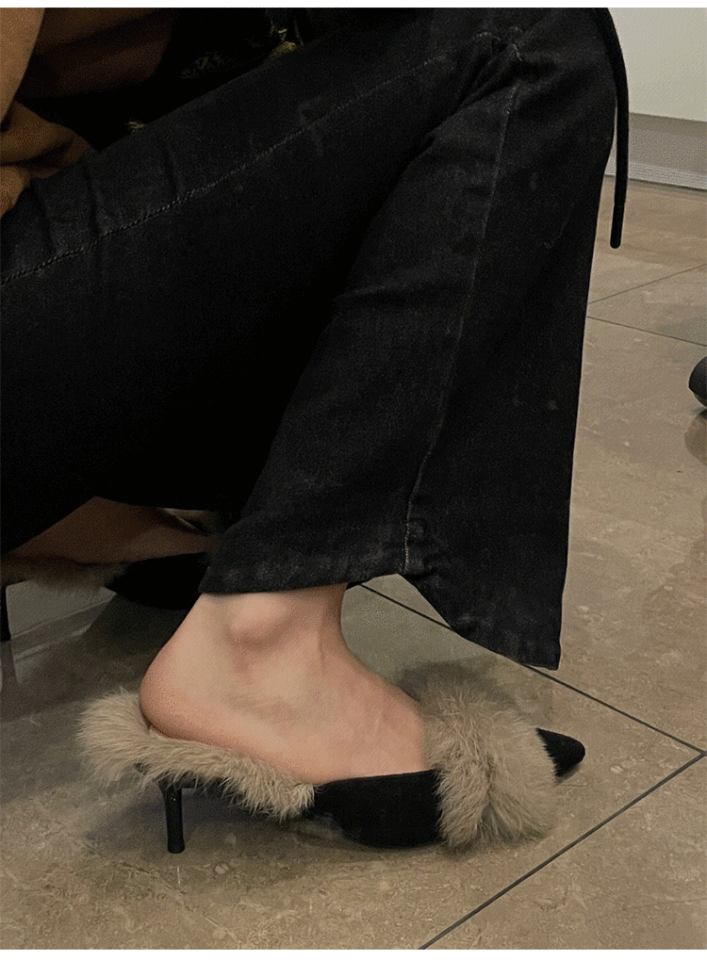 รองเท้าส้นสูงแบบมูลส์หัวแหลมขนเฟอร์สำหรับผู้หญิง คอลเลคชั่นฤดูใบไม้ร่วง/ฤดูหนาว 2024 สีดำ/สีแอพริคอต ไซส์ 34-39