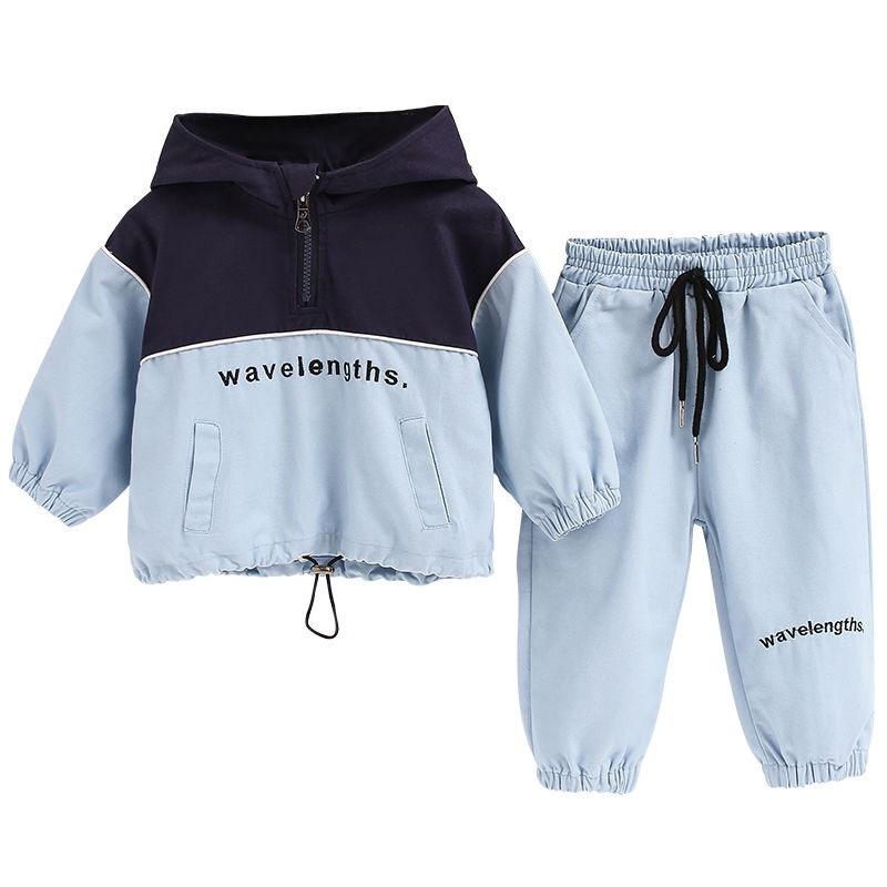 ชุดเสื้อผ้าเด็กผู้ชายลำลองสำหรับฤดูใบไม้ร่วงและฤดูหนาว ผ้าฝ้าย 100% ชุดเสื้อแจ็คเก็ตแขนยาวสีเข้าชุด + กางเกงขายาวมีเชือกผูกเอว