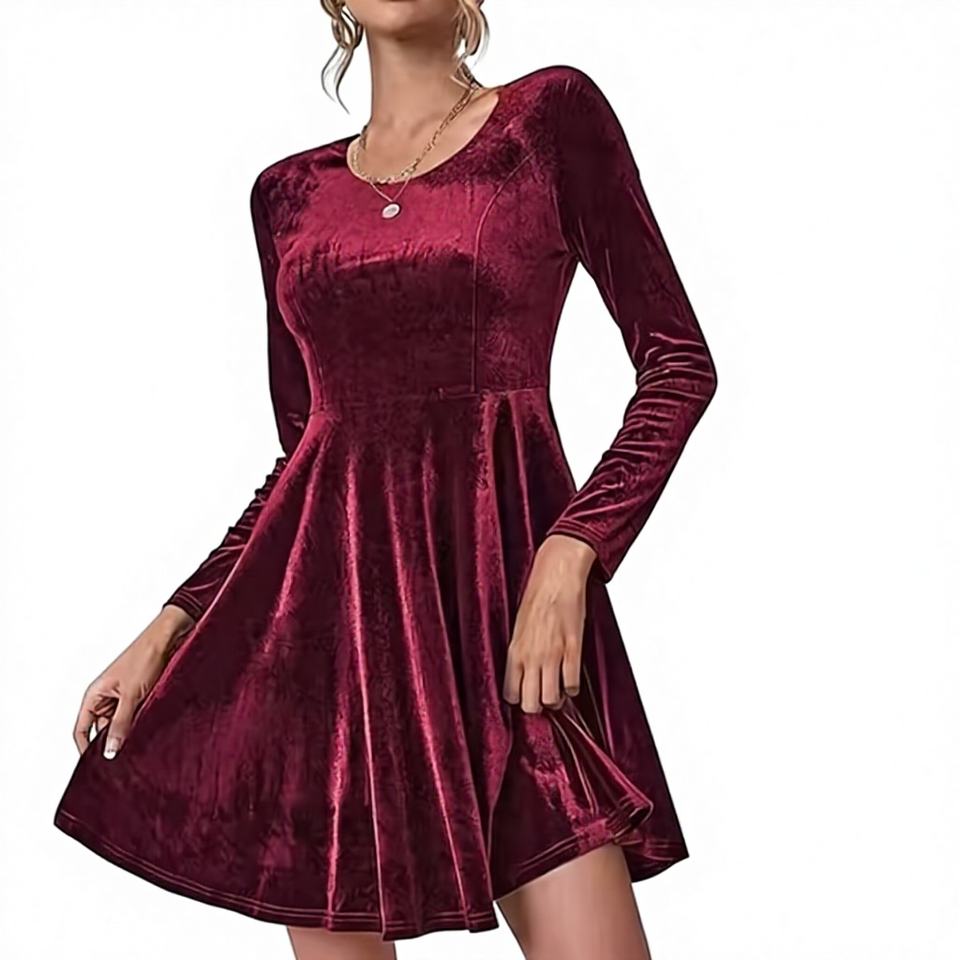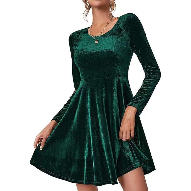 เดรสทรงเอไลน์กำมะหยี่แบบใหม่สำหรับฤดูใบไม้ร่วงและฤดูหนาว ดีไซน์หรูหรา คอทรงกลม แขนยาว ลายเรียบ เอวเข้ารูป