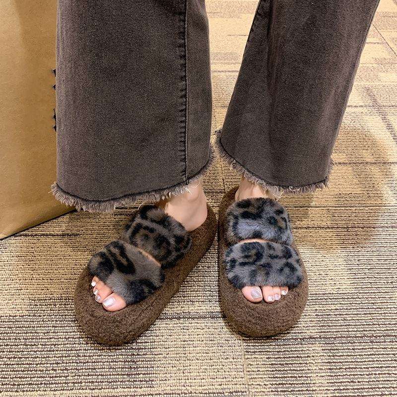 แฟชั่นฤดูใบไม้ร่วงฤดูหนาวสำหรับผู้หญิง รองเท้าแตะขนเฟอร์แบบใหม่สำหรับใส่กลางแจ้ง ผ้าฝ้ายขนปุยสำหรับรองเท้าแตะ