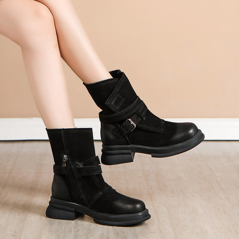 รองเท้าบูทหนังวัวสไตล์อังกฤษสุดหรูสำหรับฤดูใบไม้ร่วงและฤดูหนาว ใส่สบาย ไซส์ใหญ่ ปิดซิป กันลื่น ส้นบุขน สไตล์ตะวันตก สีดำ