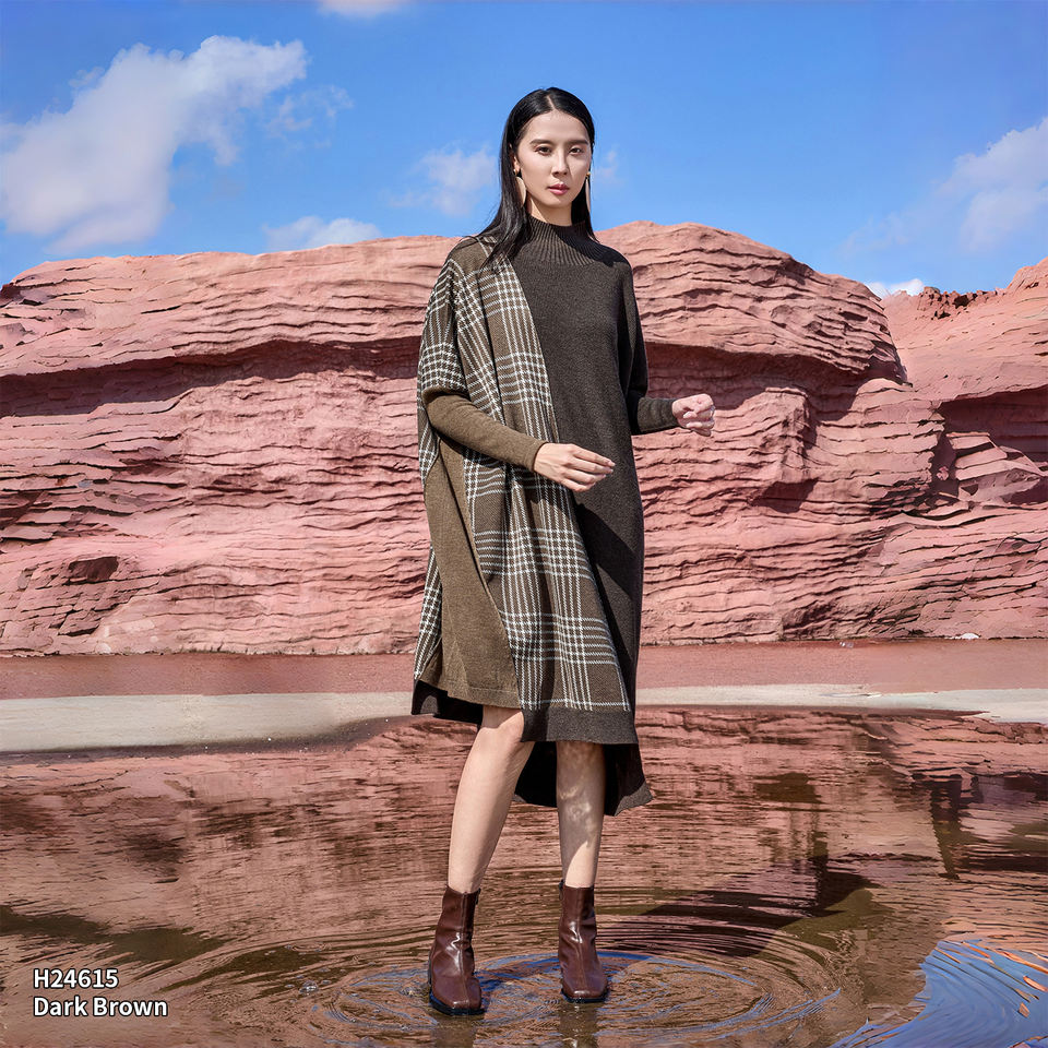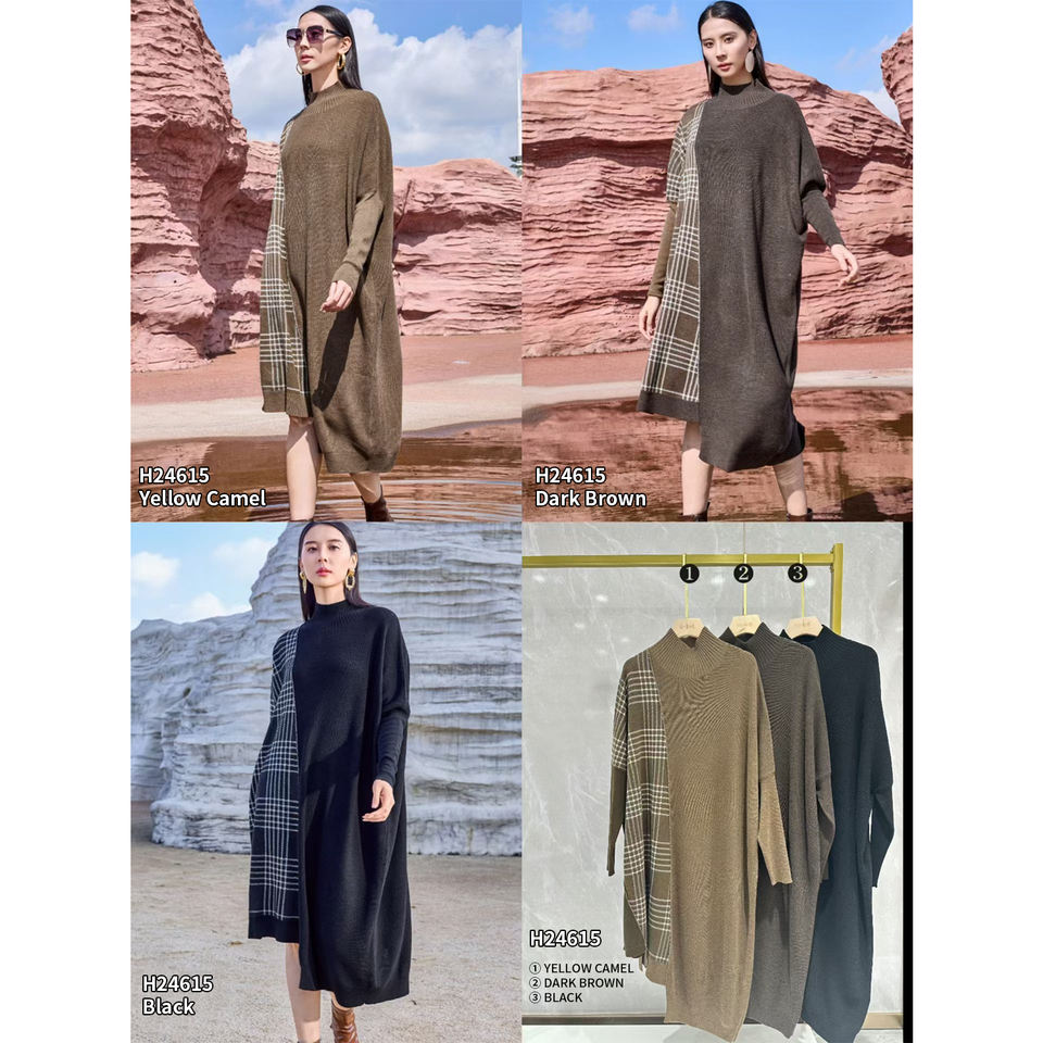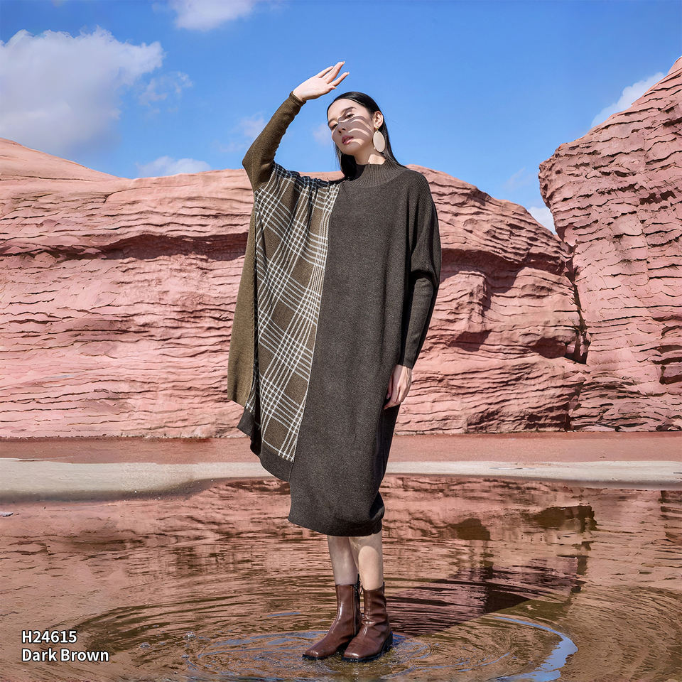 เดรสแฟชั่นมาใหม่สำหรับฤดูใบไม้ร่วง/ฤดูหนาว ลายฮาวด์ทูธ สองสี ทรงไม่สมมาตร