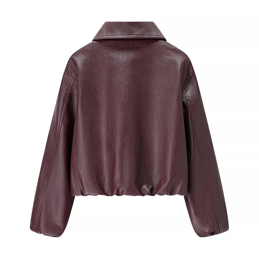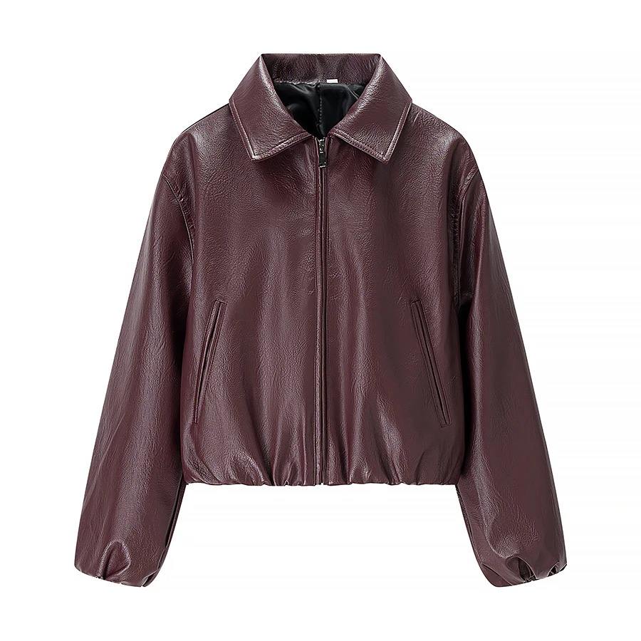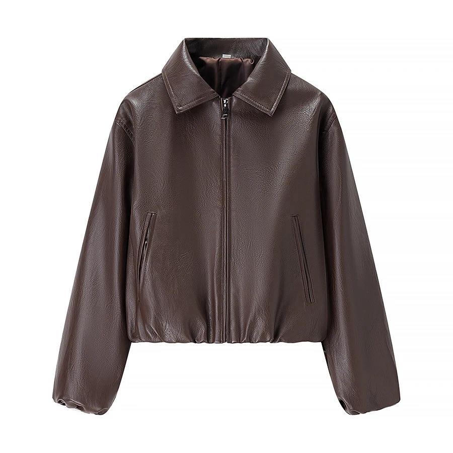 เสื้อโค้ทหนังเทียม แขนยาว ลายเรียบ คอปกพับ ซิปหน้า แฟชั่นใหม่สำหรับผู้หญิง ฤดูใบไม้ร่วง/ฤดูหนาว ผลิตจากโพลีเอสเตอร์