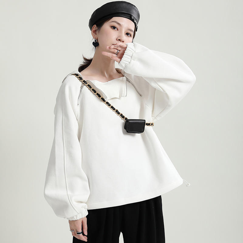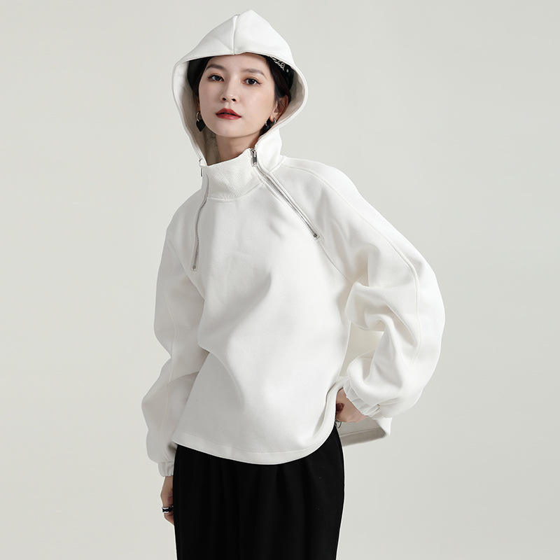 เสื้อกันหนาวผู้หญิงแบบมีฮู้ด ผ้ากำมะหยี่บุหนา ทรงหลวม คอสูง สำหรับฤดูใบไม้ร่วงและฤดูหนาว
