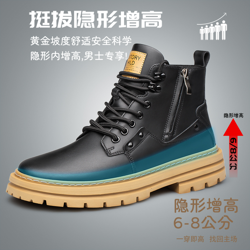 รองเท้าบูททำงานผู้ชายทรงสูงบุตาข่ายหนังวัวสุดเทรนด์สำหรับฤดูใบไม้ร่วงและฤดูหนาว สไตล์อังกฤษ เพิ่มความสูงแบบซ่อน