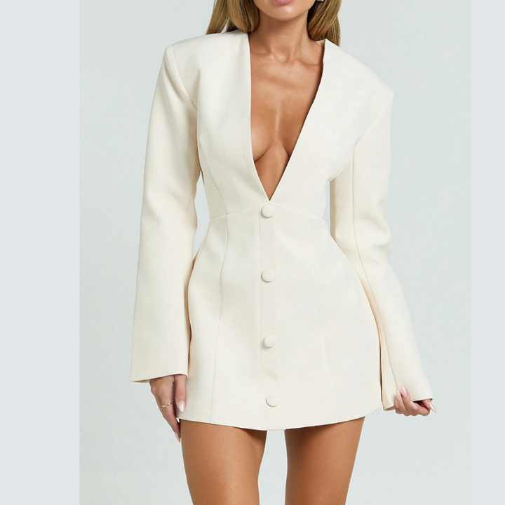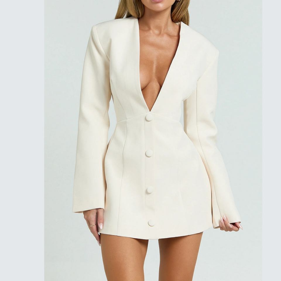 ชุดเดรสสไตล์ฝรั่งเศสแขนยาวสำหรับผู้หญิงช่วงฤดูใบไม้ร่วง คอวีติดกระดุมสองแถว สีพื้น เรียบหรู ทรงมินิเดรสแบบเบลเซอร์