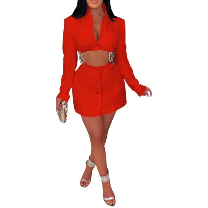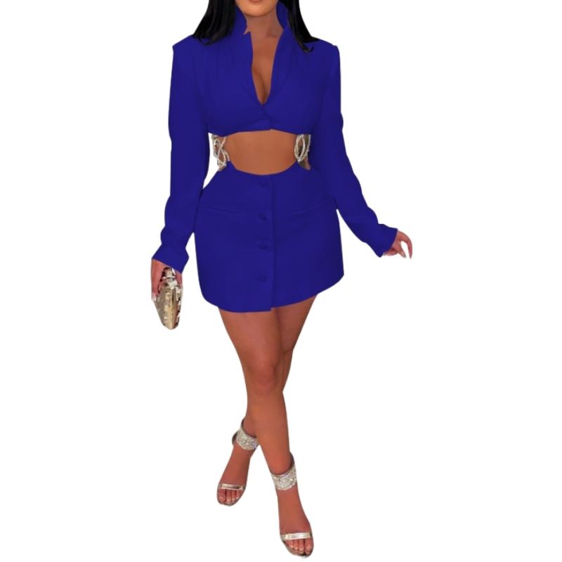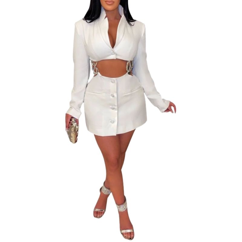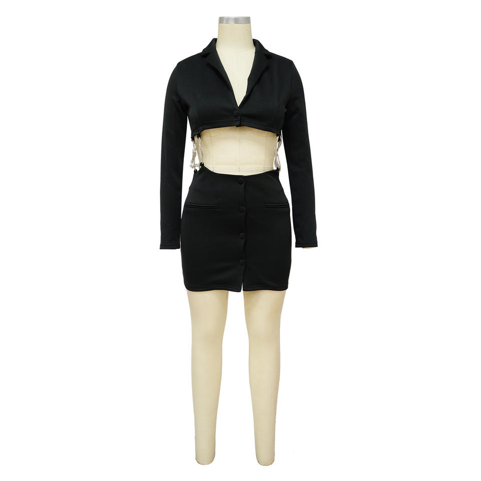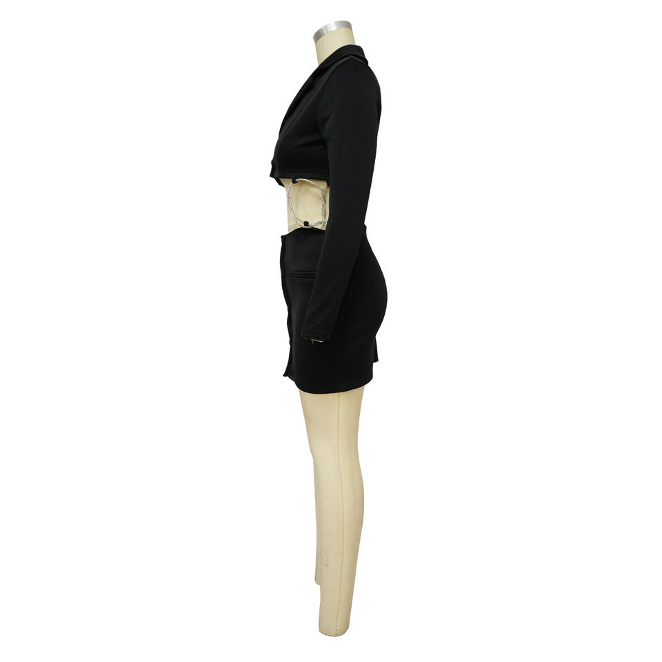 เดรสแฟชั่นผู้หญิงสำหรับฤดูใบไม้ร่วงและฤดูหนาว คอวีลึก สีพื้น แต่งลายฉลุ ประดับโซ่และเพชร