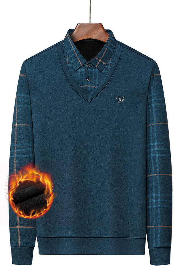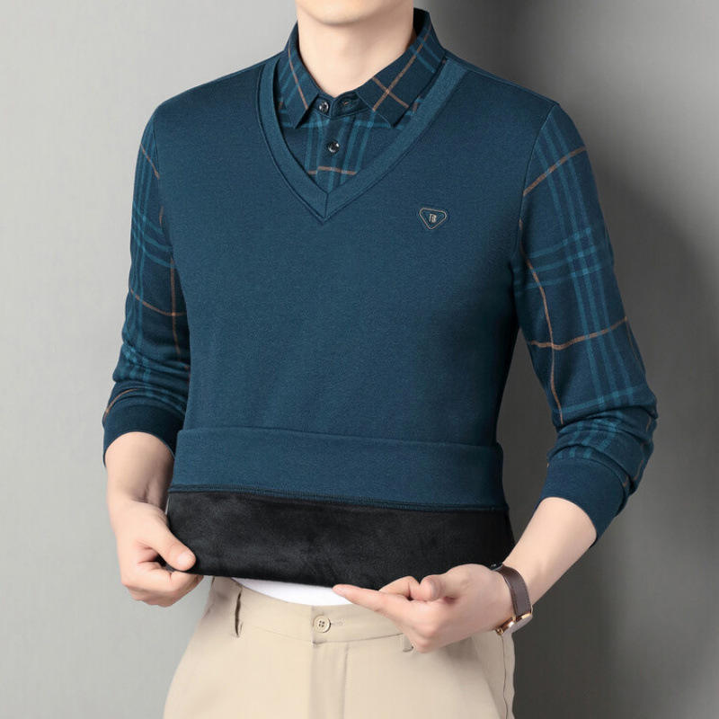 เสื้อเชิ้ตไหมพรมหนานุ่มสำหรับผู้ชายสไตล์ใหม่ประจำฤดูใบไม้ร่วงและฤดูหนาว ลายพิมพ์แขนยาวสำหรับผู้สูงอายุ ลายสก็อต