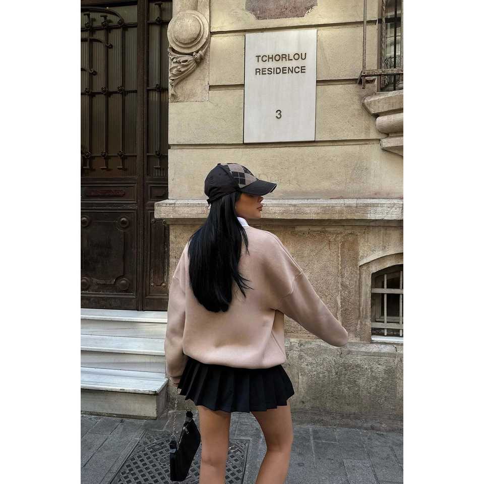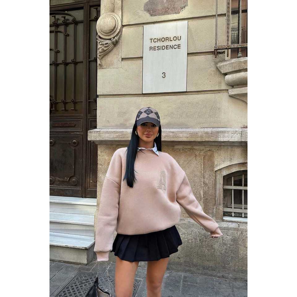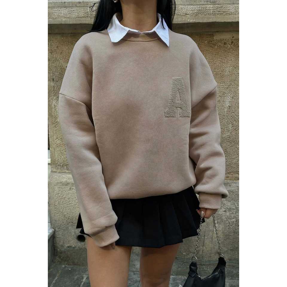 เสื้อสเวตเชิ้ตผ้าไหมสำหรับฤดูใบไม้ร่วงและฤดูหนาว สีเบจ มีฮู้ด ปักลายตัวอักษร 3 มิติ ด้านหน้าพิมพ์ลายโลโก้ ไซส์ XS