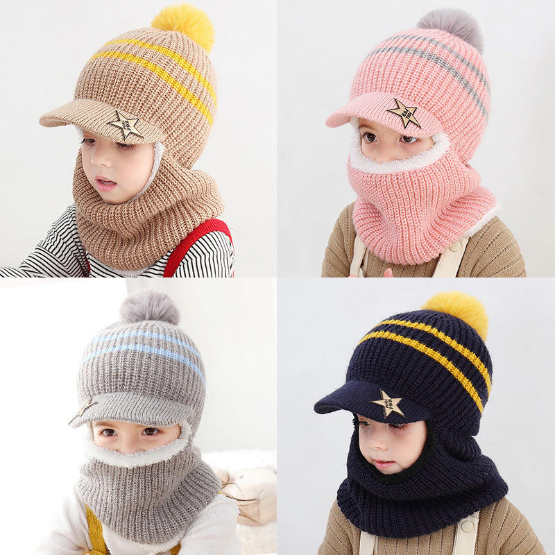 หมวกกันลมและหูปกป้องเด็ก, 2-7years ฤดูใบไม้ร่วงและฤดูหนาวพร้อมผ้าพันคอหมวกถักตุ๊กตาสำหรับเด็ก