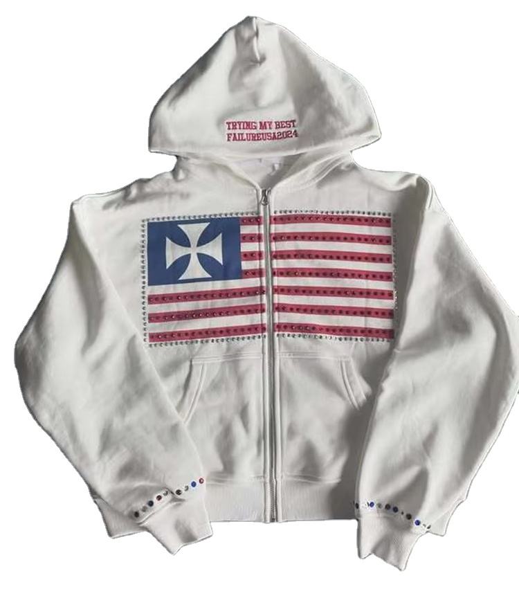 เสื้อฮู้ดผู้ชายลายธงชาติฤดูหนาว ดีไซน์มินิมอล ลายสีตัดกัน สไตล์ฮาราจูกุ Y2K ทรงปกติ ปักลาย