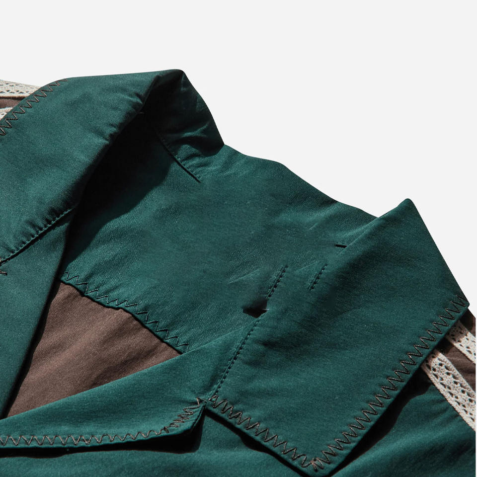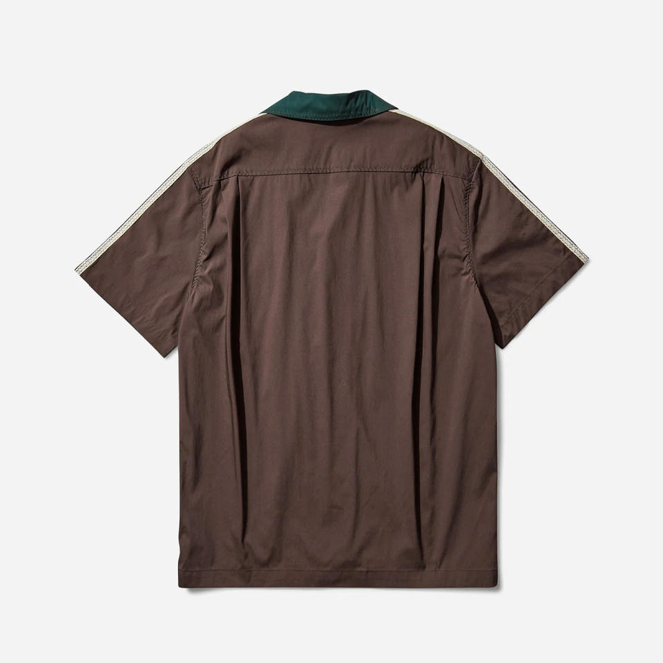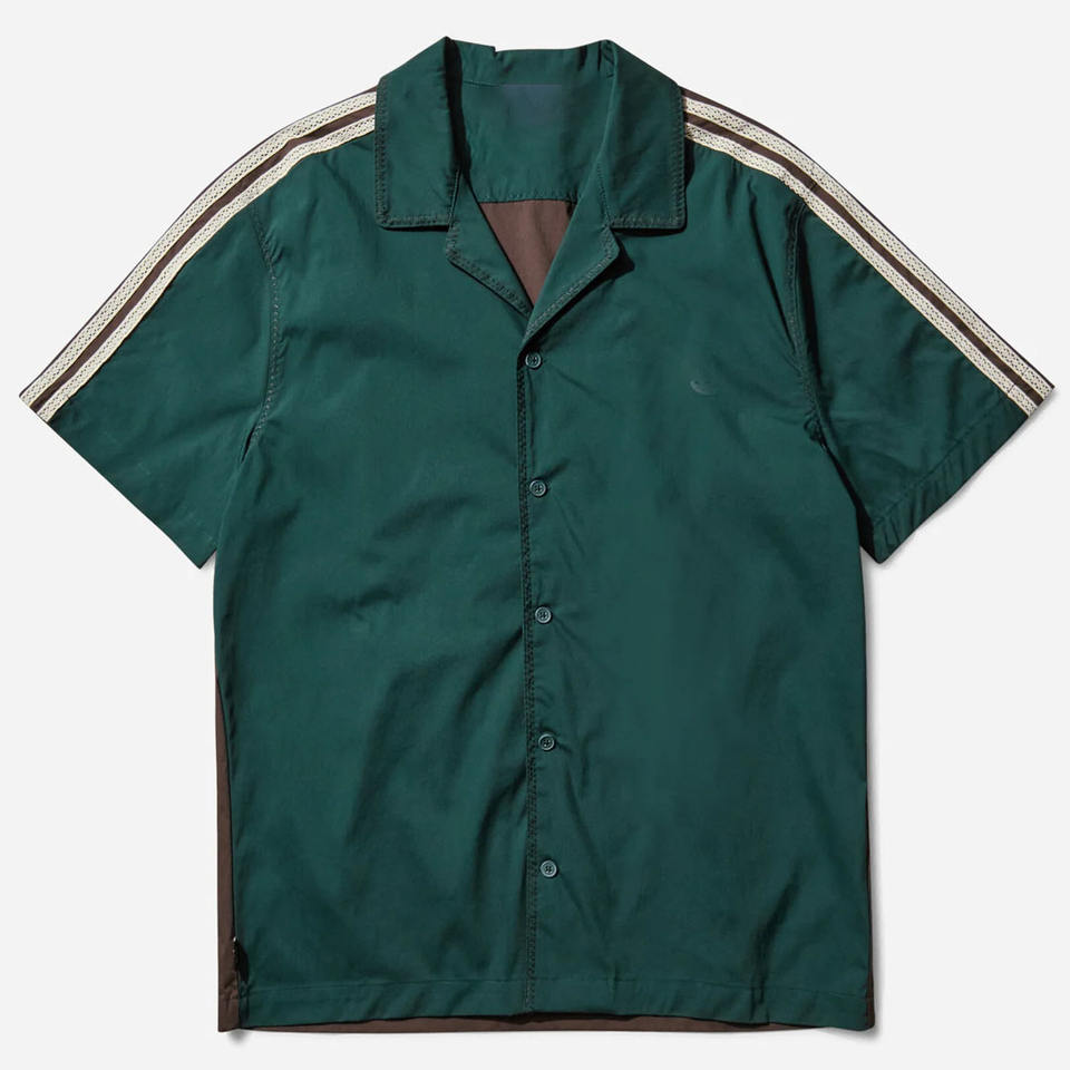 เสื้อเชิ้ตโบว์ลิ่งสีเขียวเข้มสำหรับผู้ชาย แขนสั้น คอปกแคมป์ ลายทางที่แขนเสื้อ สไตล์วินเทจลำลอง ติดกระดุม