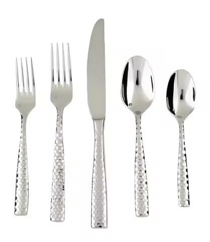 ชุดช้อนส้อมสแตนเลสสีทอง ดีไซน์สวยงาม 5 ชิ้น สำหรับห้องอาหารและโรงแรม มีส้อม มีด และช้อน