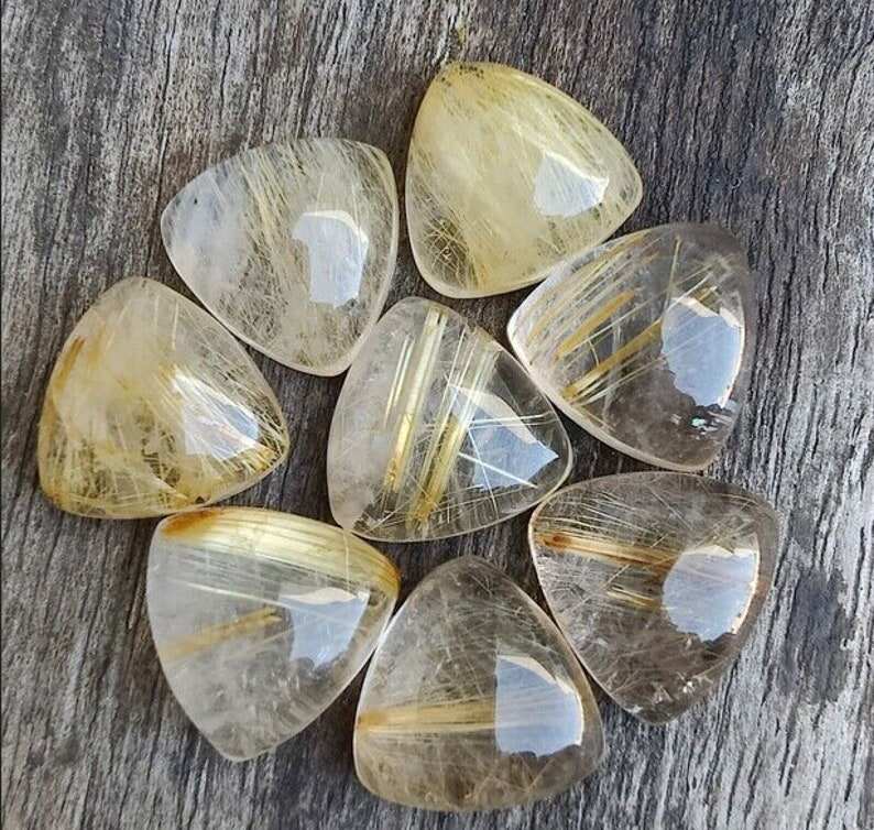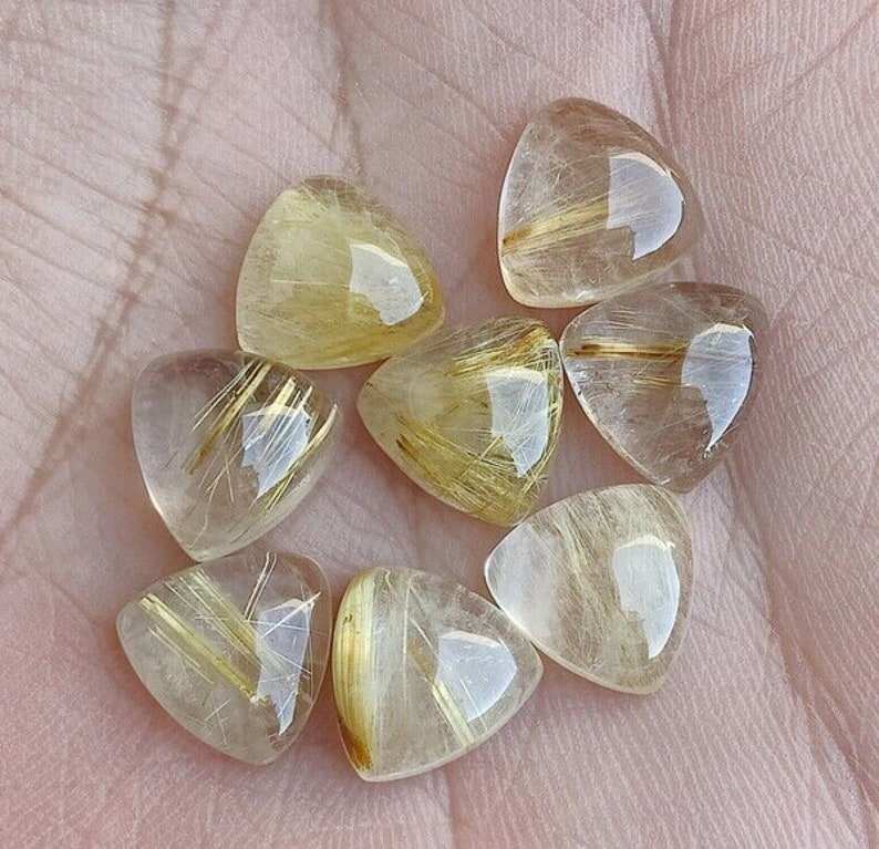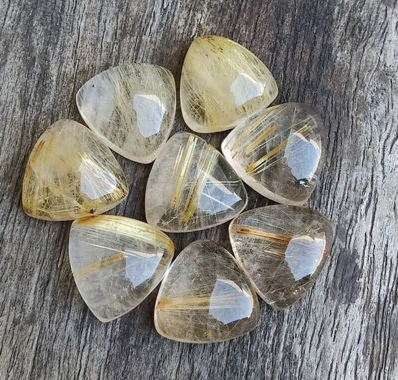 พลอยคาโบชองทรงสูงล้านรูไทล์สีทองโก้เก๋พลอยหลังแบนอัญมณีธรรมชาติเจียระไนแบบรูไทล์สีทองเพื่อการทำเครื่องประดับ