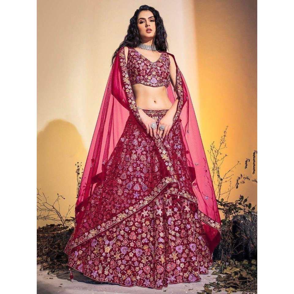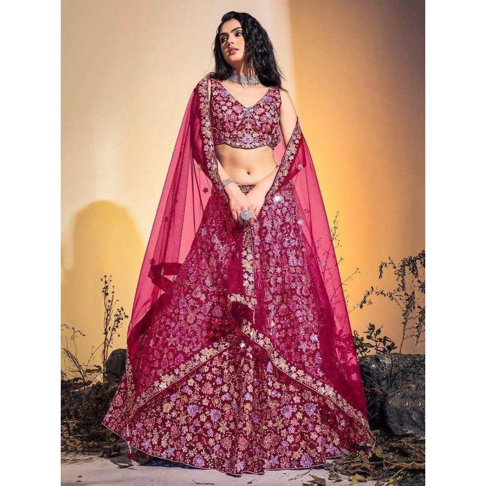 ชุดแต่งงานผ้าเน็ตปักลายสีชมพูสวยงาม ชุดเลเฮนกาโชลีสวมใส่สบายสำหรับเจ้าสาว