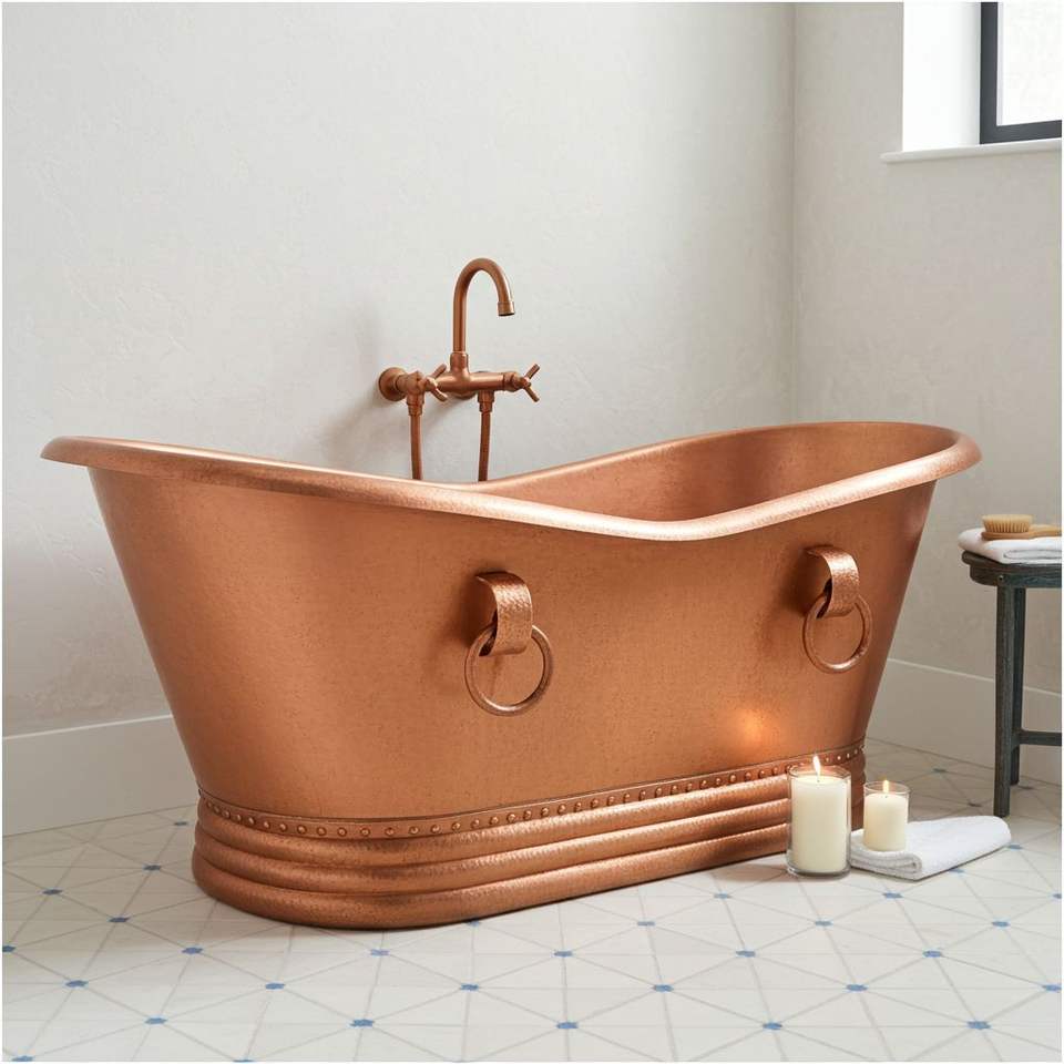 อ่างอาบน้ำแบบลอยตัวสุดหรูจาก Axiom Home Accents ผลิตจากทองแดงทำมือ ตกแต่งสไตล์โบราณ เป็นมิตรกับสิ่งแวดล้อม รองรับผู้ใช้ 1 คน เหมาะสำหรับบ้านสไตล์โมเดิร์น