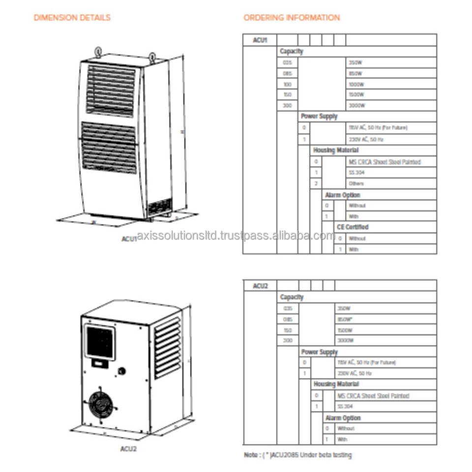 เครื่องปรับอากาศแบบติดตั้งภายในอาคาร Axis ACU11001111 กำลังไฟ 1000 วัตต์ วัสดุสแตนเลส SS304 ได้รับการรับรองมาตรฐาน CE ใช้ไฟ 230 โวลต์ AC 50 เฮิรตซ์ ใช้สารทำความเย็น R134a พร้อมคอมเพรสเซอร์แบบลูกสูบ