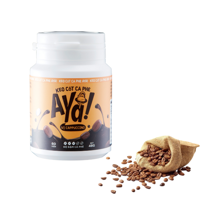 ลูกอมกาแฟเข้มข้น รสคาปูชิโน่ ยี่ห้ออาญา ขายดี ใช้งานง่าย บริการ OEM ผลิตในเวียดนาม คุณภาพพรีเมียม บรรจุขวด