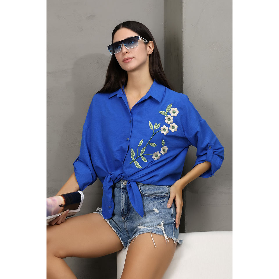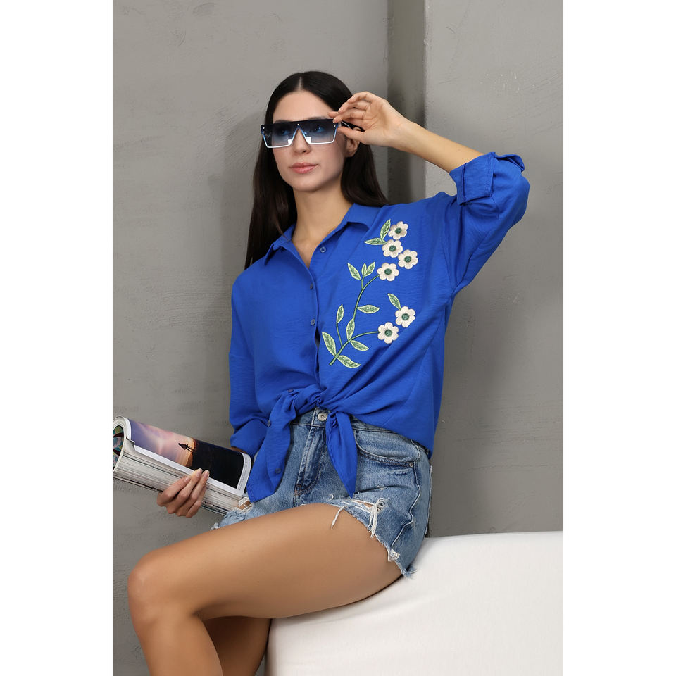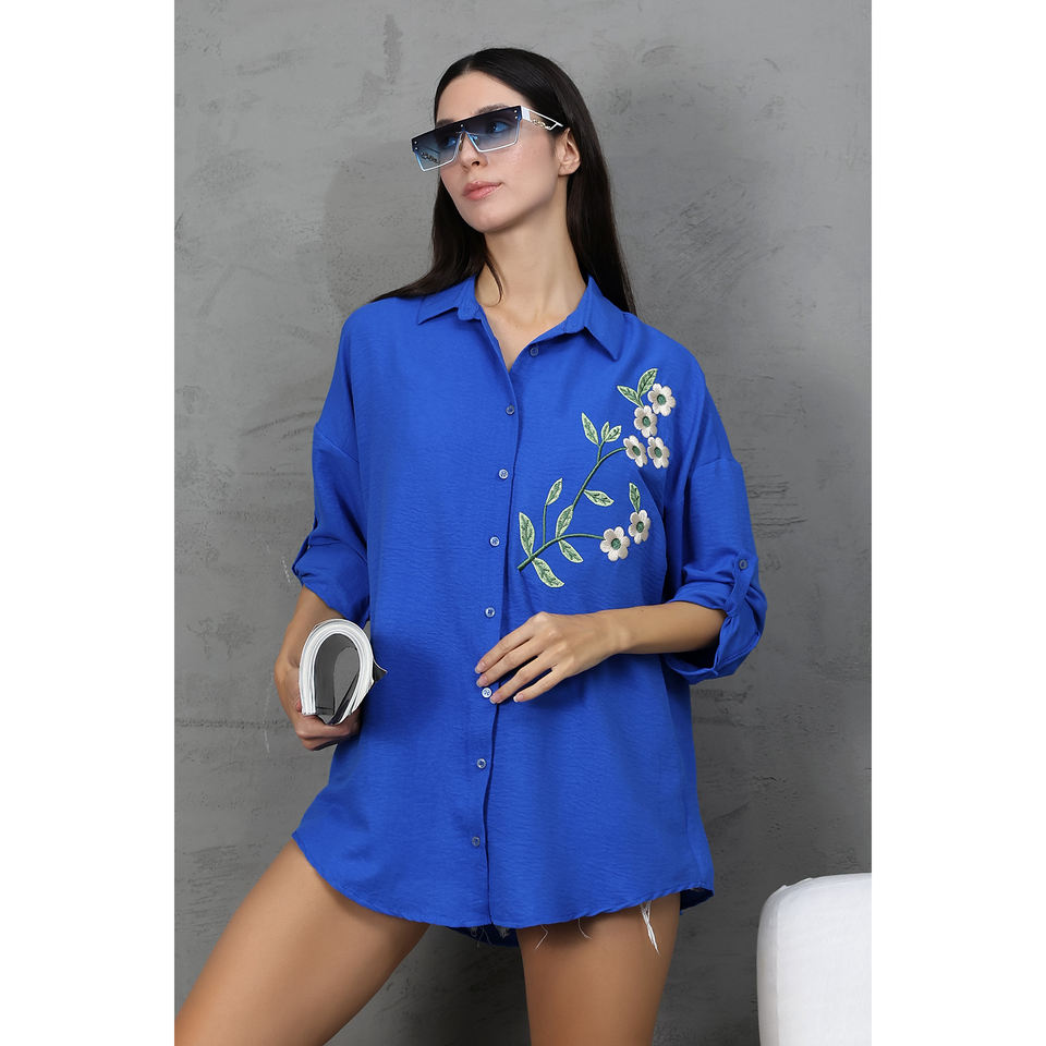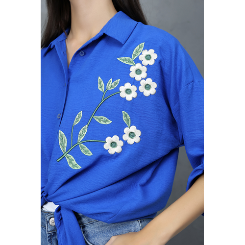 Ayrobin Women's Blue Shirt with Low Sleeve Oversize Sleeve 6 Flower Embroidery Available in Sizes S-M-L-XL