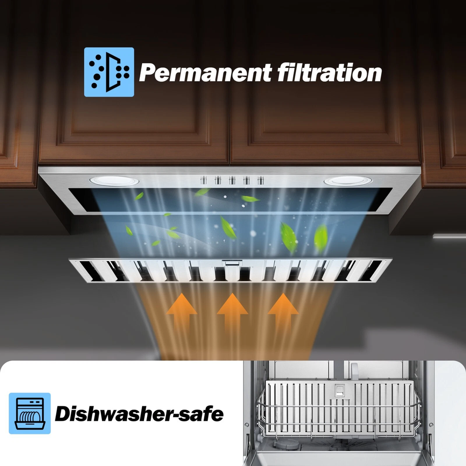 ฮูดดูดควันในครัวแบบติดตั้งในตัว ขนาด 20 นิ้ว ทำจากสแตนเลส พร้อมท่อระบายอากาศ 3 ระดับความเร็ว