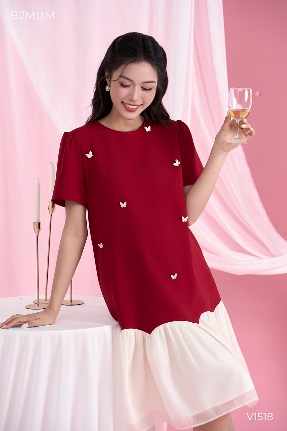 B2เดรสคอวีสีแดงสำหรับคุณแม่ V1518ผ้าลูกไม้ระบายอากาศได้ดีเป็นมิตรกับสิ่งแวดล้อมทรงเอไลน์เงาอัดพลีทเล็กน้อยกระโปรงสองชั้น