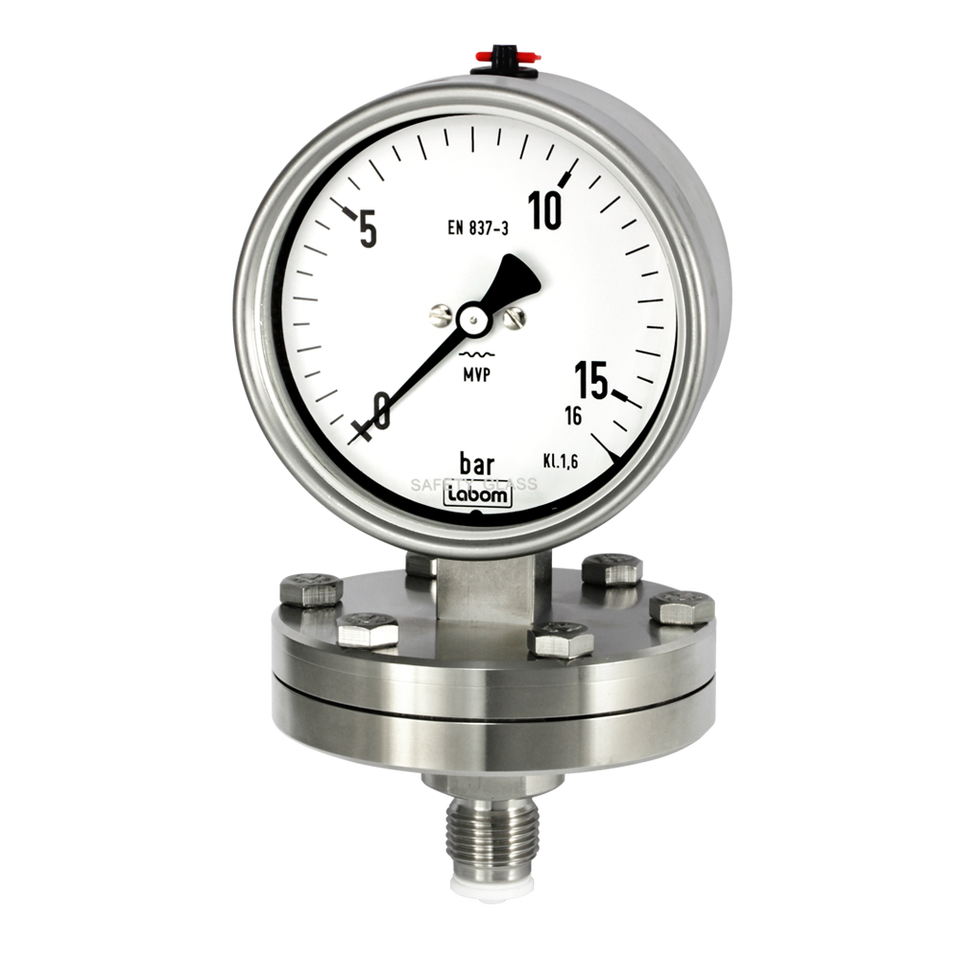 มาโนมิเตอร์สแตนเลส100มม. พร้อมฐานยึดด้านล่างสำหรับติดตั้ง432.50และ433.50