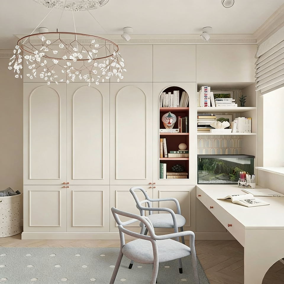 ตู้เสื้อผ้าไม้จริงทรงตัวแอลแบบกำหนดเองของ BALOM พร้อมโต๊ะทำงาน ชุดเฟอร์นิเจอร์ห้องนอนทันสมัย พร้อมชั้นวางหนังสือแบบเปิดหลายชั้น