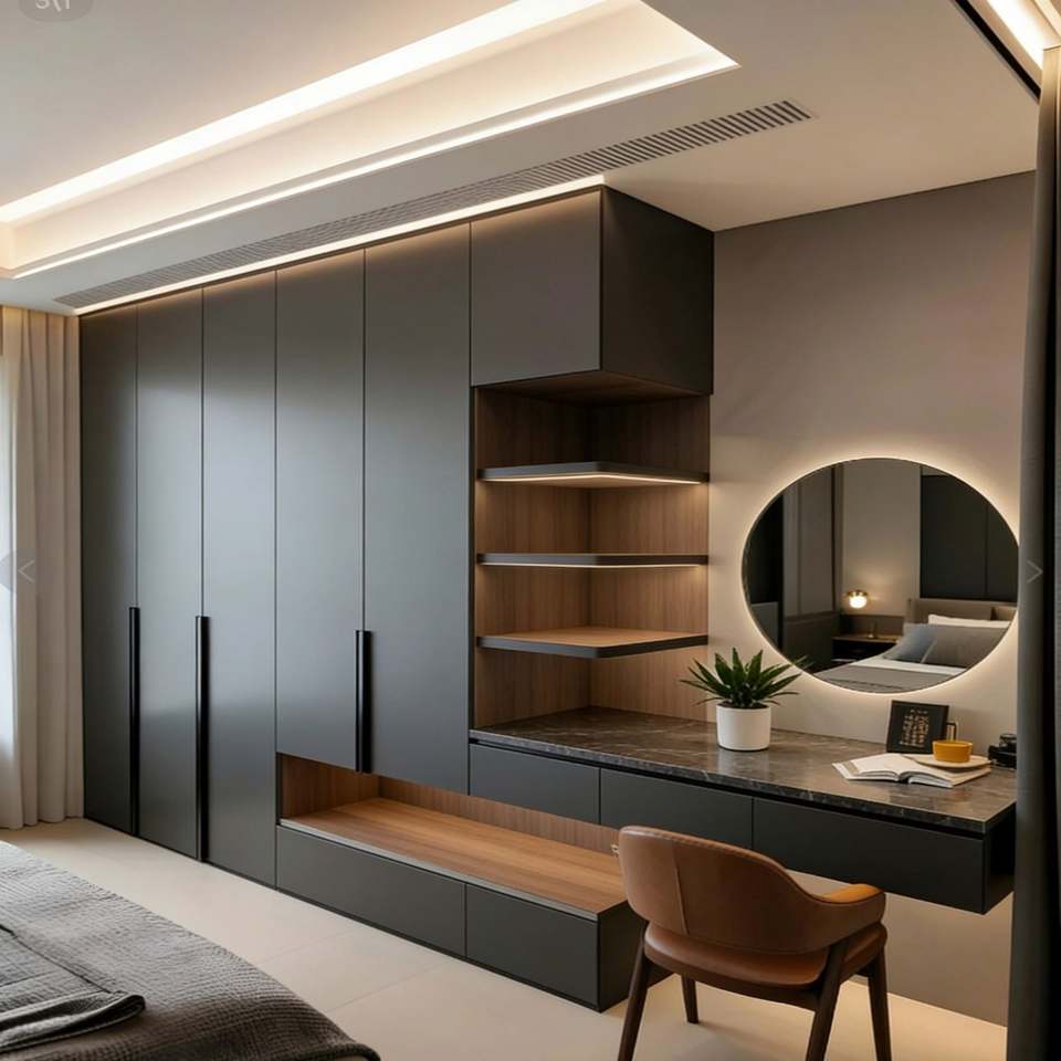 ตู้เสื้อผ้าแบบโมดูลาร์ BALOM สีเข้ม พร้อมโต๊ะแต่งตัวในตัวและช่องวางต้นไม้ ตู้เสื้อผ้าอัจฉริยะพร้อมไฟส่องสว่าง