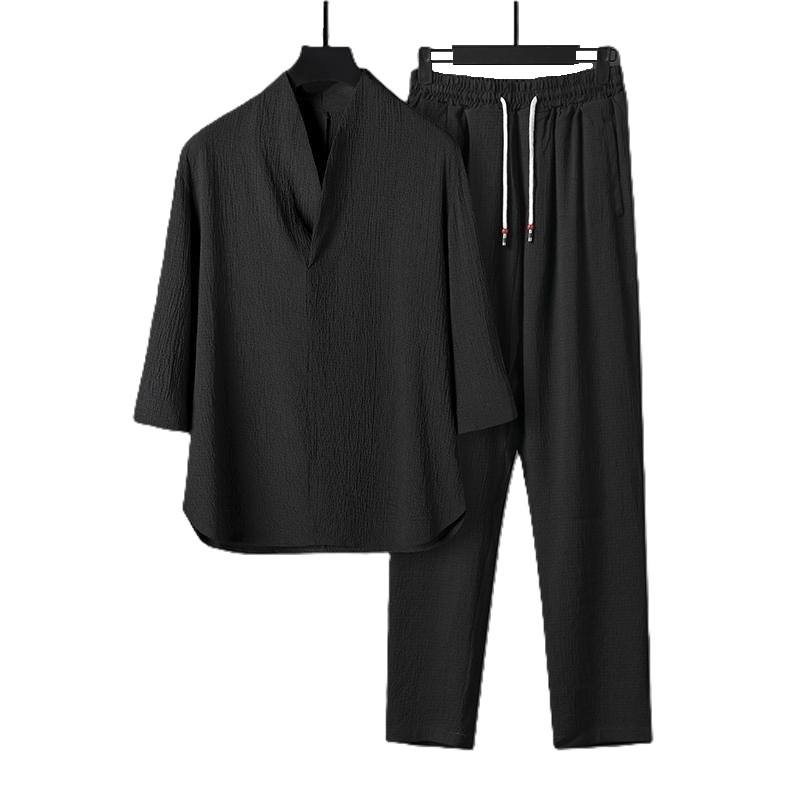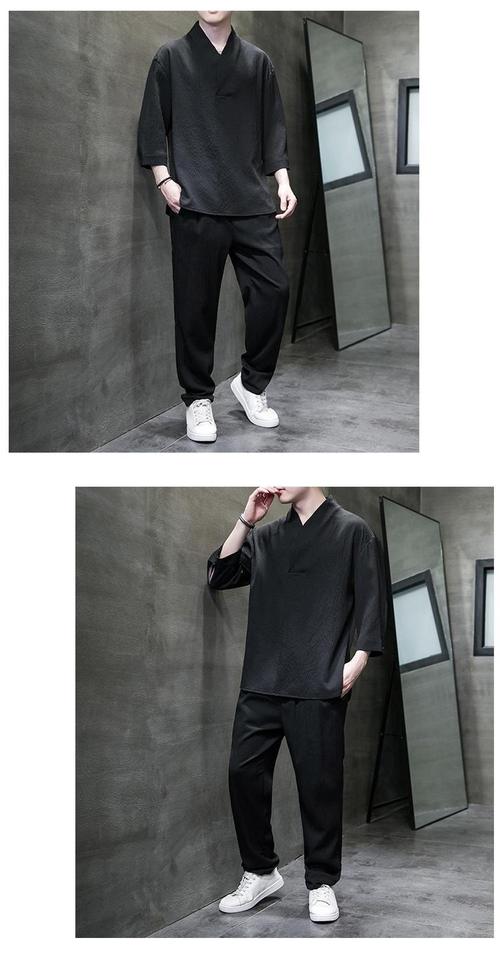 ชุดเซ็ตเสื้อผ้าสไตล์จีนสีขาวดำ ปักโลโก้ตามสั่ง ผลิตในจีน ทรงเข้ารูป คอเสื้อแบบคลาสสิก แขนสามส่วน แห้งเร็ว