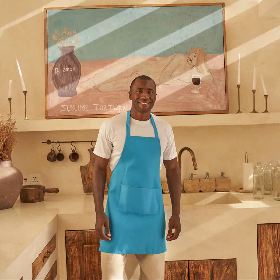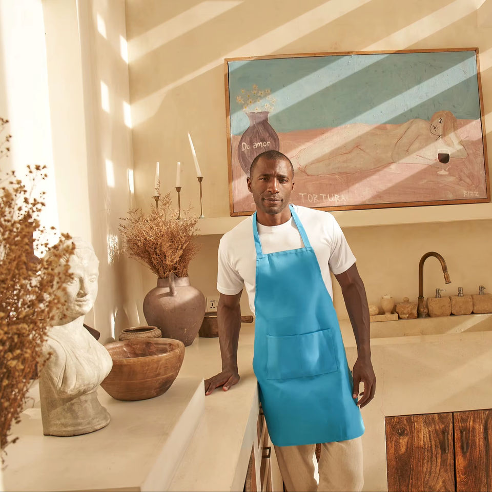ผ้ากันเปื้อนทำอาหารแบบไม่มีแขน ผลิตจากโพลีเอสเตอร์ 100% ระบายอากาศได้ดี เป็นมิตรกับสิ่งแวดล้อม ซึมซับความชื้น ประหยัดน้ำ มีกระเป๋าหน้า