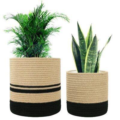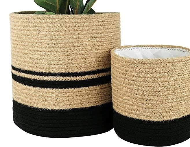 ตะกร้าเก็บของทรงกลมถักจากเชือกฝ้ายสีเบจและสีดำ ทันสมัย เป็นมิตรกับสิ่งแวดล้อม ใช้ได้หลากหลาย สำหรับบ้านและสวน