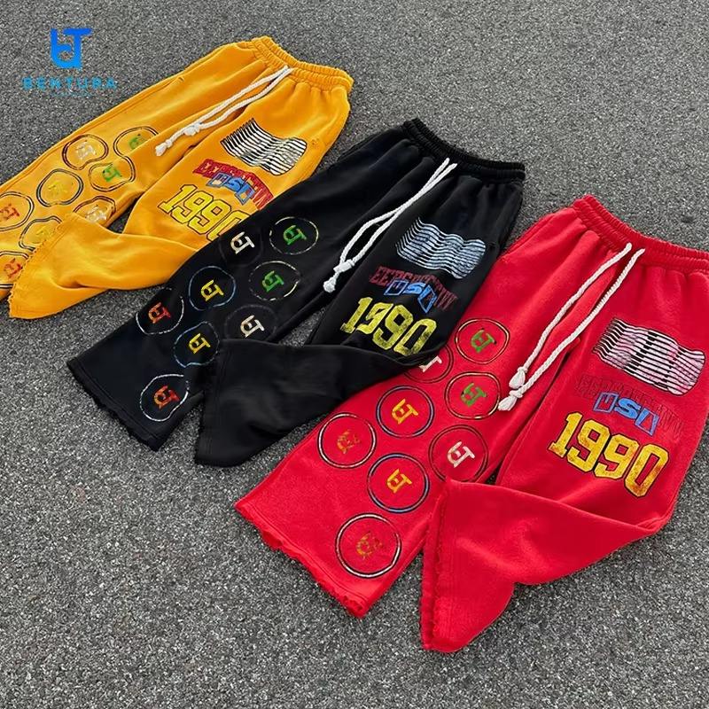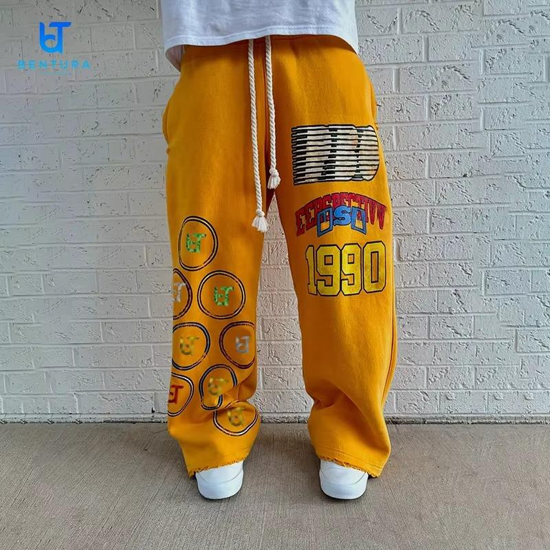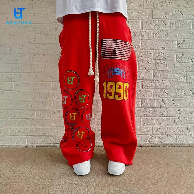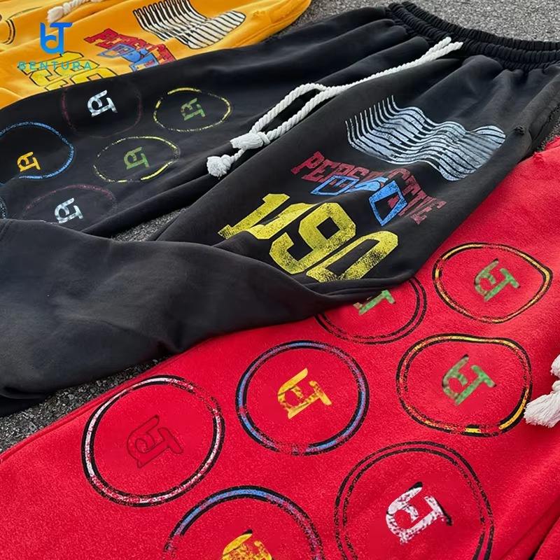 กางเกงวอร์ม BENTURA สตรีทแวร์ขายดี พิมพ์ลาย DTG ล้างสีแบบ Acid Wash แต่งขาด ปักโลโก้ตามสั่ง ผ้าฝ้าย 100% สำหรับผู้ชาย