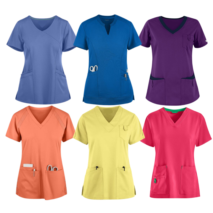 ขายดีที่สุด สครับด้านบน พยาบาลแฟชั่นสไตล์ใหม่ คอวี ชุดแพทย์ เสื้อผ้าโรงพยาบาลสําหรับผู้หญิง นุ่มและยืดได้มาก - ขั้นต่ําขั้นต่ํา